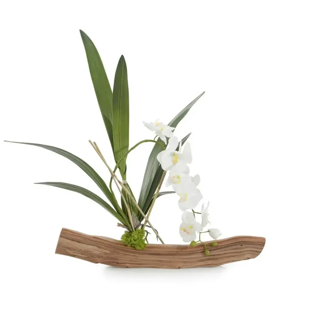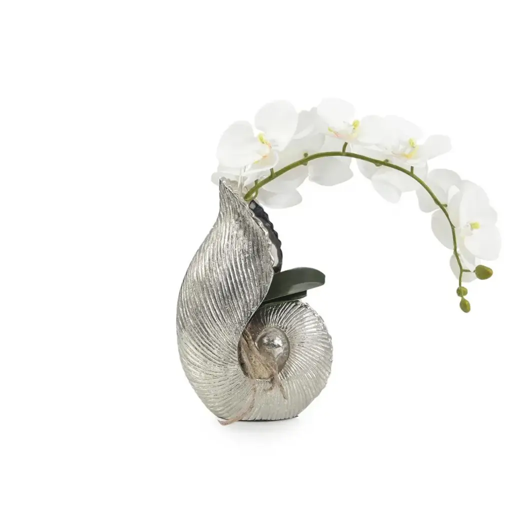 Elegant silver conch shell with natural bamboo reeds and a white phalaenopsis orchid and foliage.