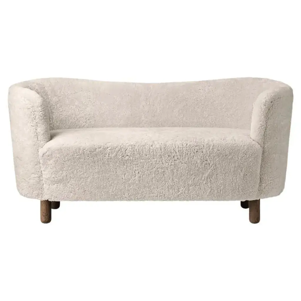 Moonlight sheepskin and smoked oak mingle sofa by Lassen. Dimensions: W 154 x D 68 x H 74 cm. Materials: sheepskin, oak. The Mingle sofa was designed in 1935 by architect Flemming Lassen (1902-1984) and was presented at The Copenhagen Cabinetmakers’ Guild Competition in the same year. It was subsequently praised for its qualities as a small but elegant sofa in the professional journal “The Architect”. Flemming Lassen loved to travel, and he was often inspired by his journeys throughout Europe. He was very taken with both Italy and France, and had a burning desire to tour those countries on his motorcycle. Flemming Lassen wanted to create a sofa made for conversation with a comfort that invited people to stay seated and talk together for long periods of time. The armrests were designed to encircle the sitters, generating intimacy and transforming the sofa into a cosy place to relax. Flemming Lassen took inspiration from both French elegance and modern Italian style, and transferred the trends and his own ideas to a small, upholstered sofa called Mingle. By Lassen is a Danish design brand focused on iconic designs created by Mogens and Flemming Lassen, founded by Lassens’ relatives in 2008.