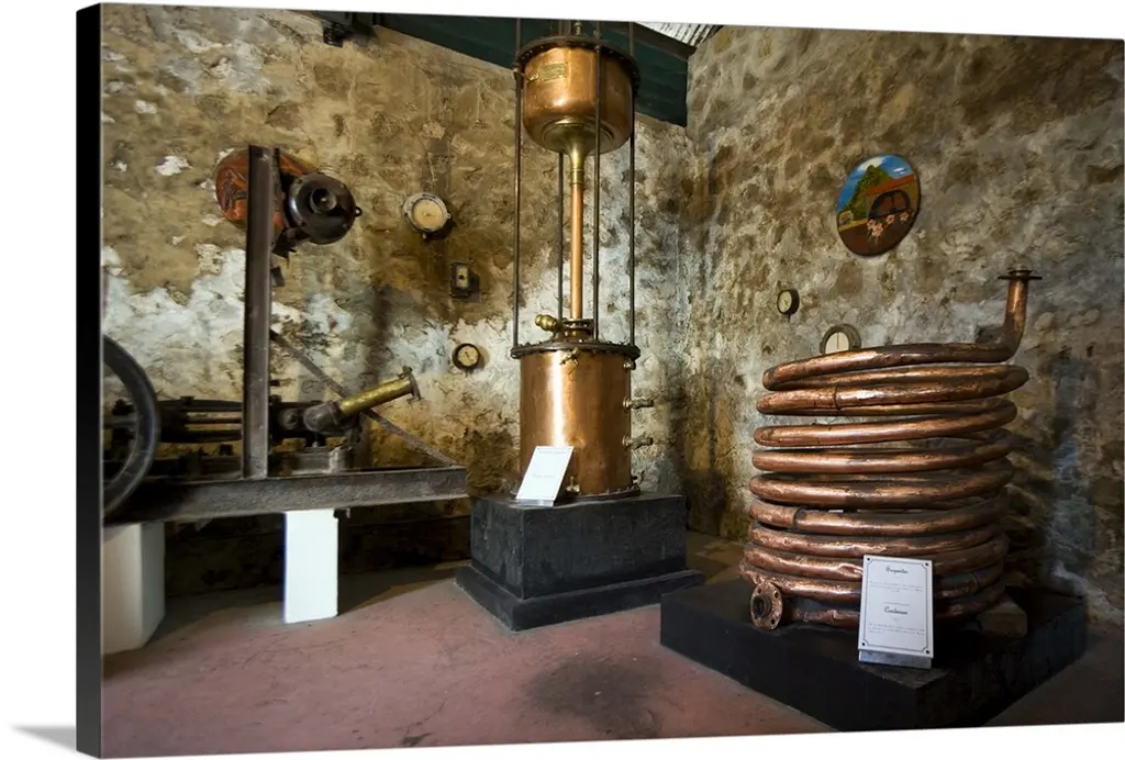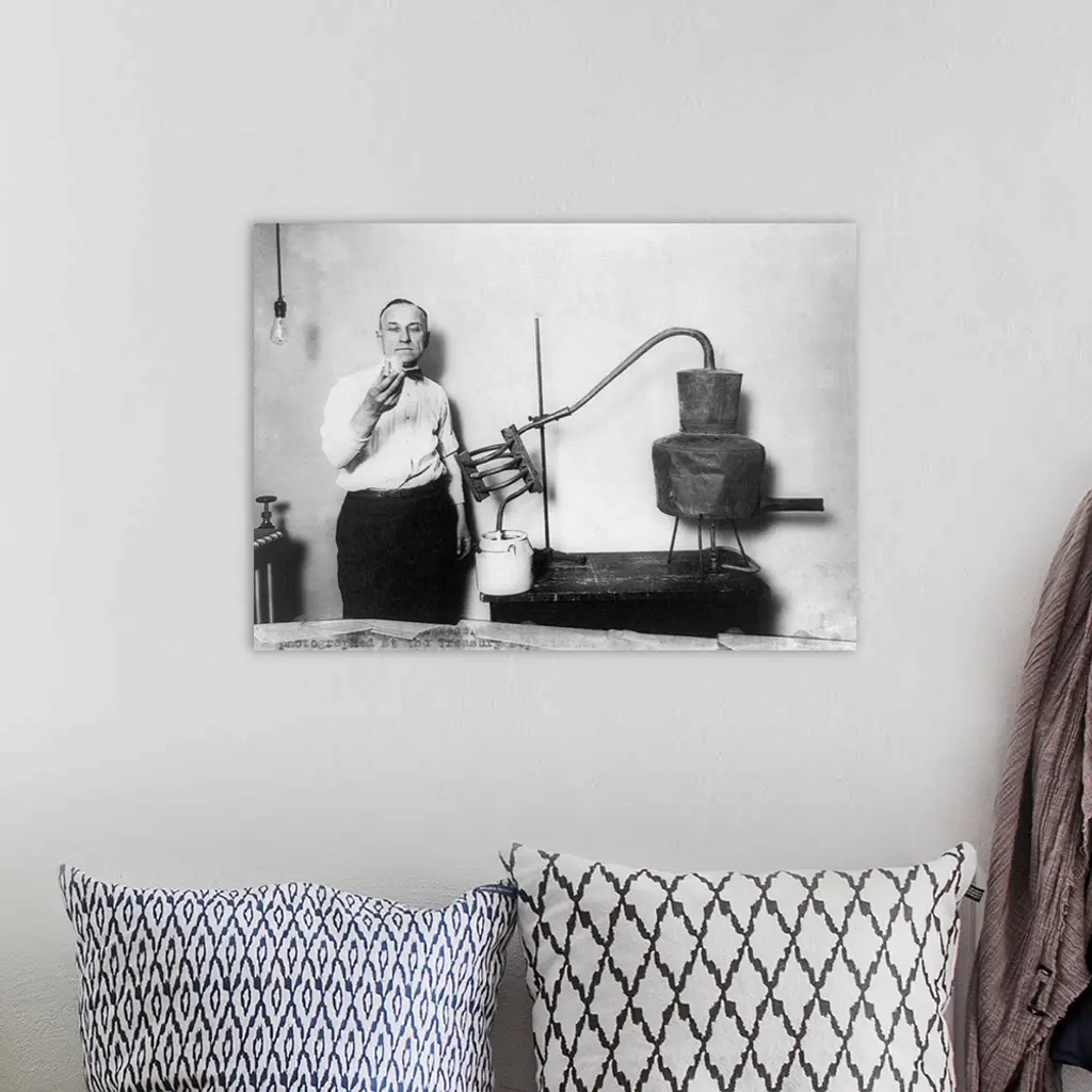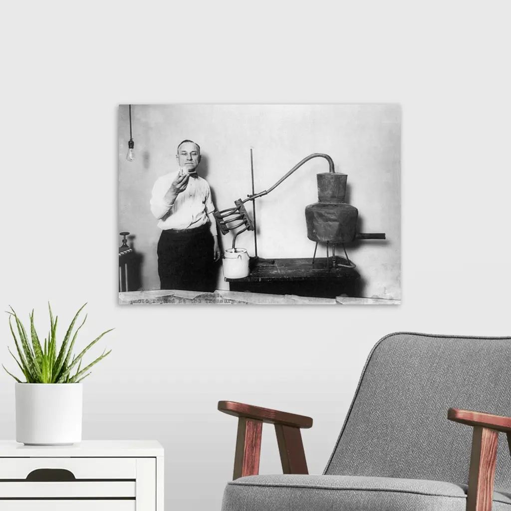Man with a confiscated moonshine distillery, photographed at the Treasury in Washington, D.C., during Prohibition, 1920s.