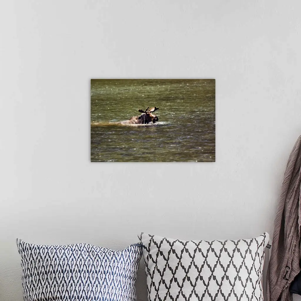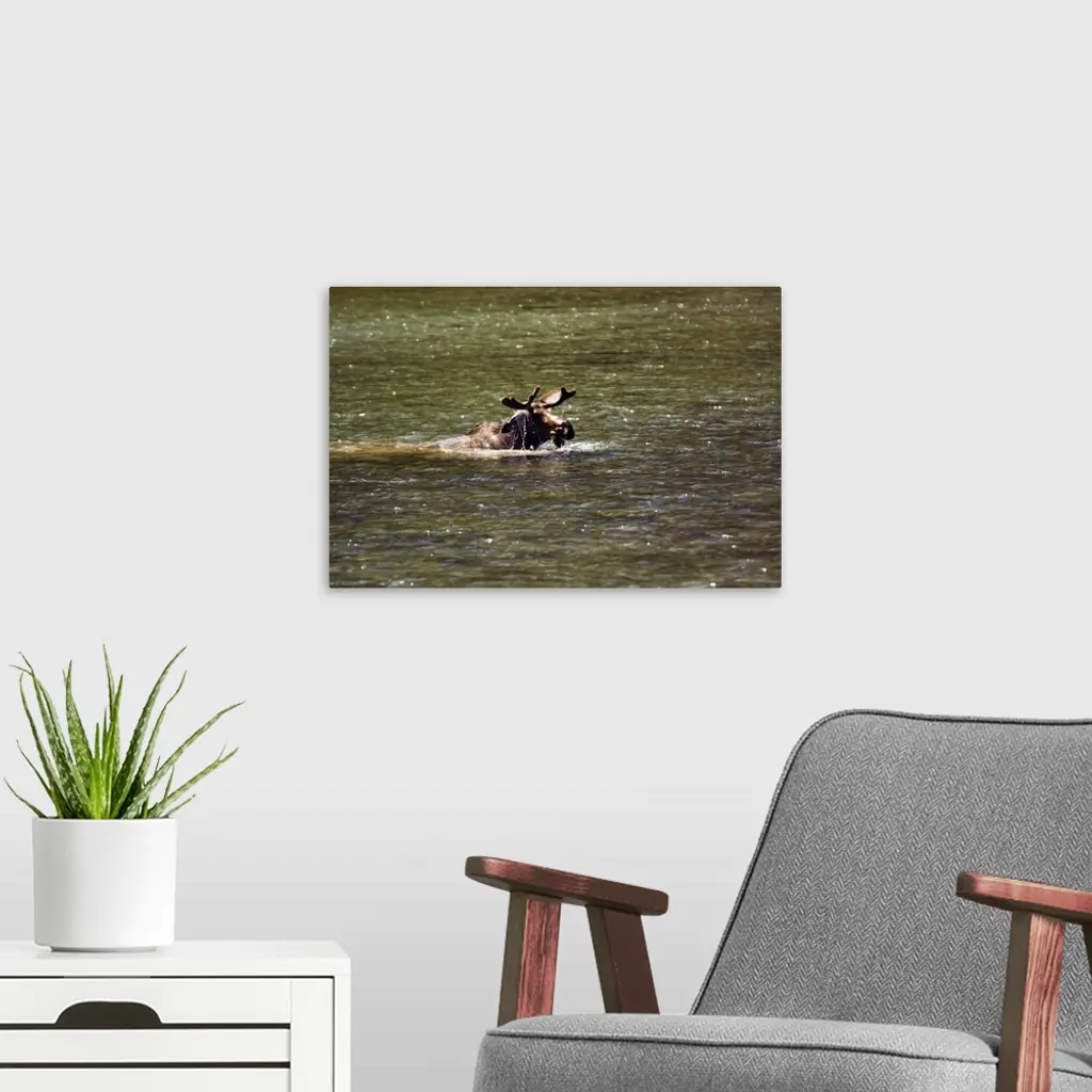 Moose swimming in river, Glacier National Park, Montana wall art for home and office decor. Discover canvas art prints, photos, mural, big canvas art and framed wall art in GreatBigCanvas.com's varied collections.