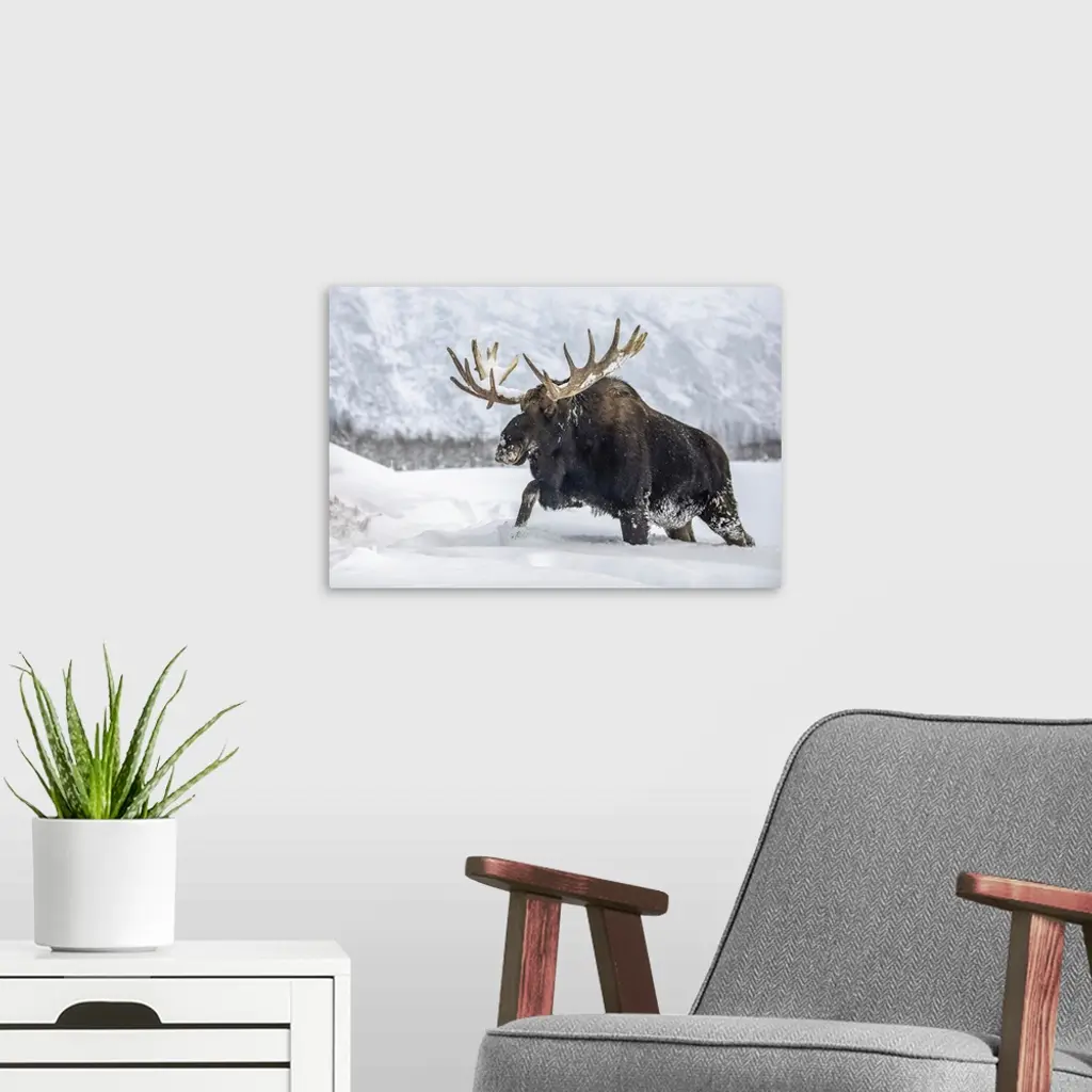 Moose With Antlers Walking In Snow, Alaska Wildlife Conservation Center, Alaska