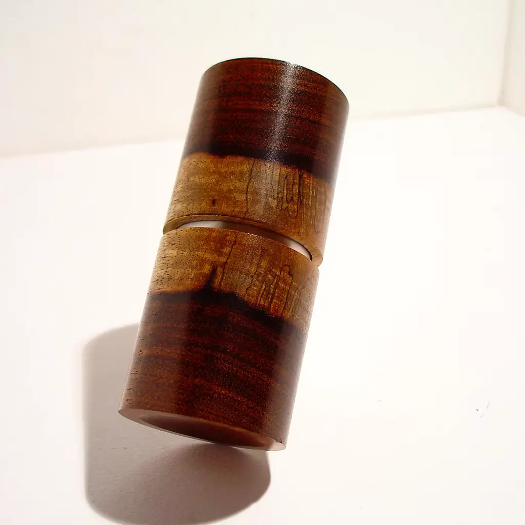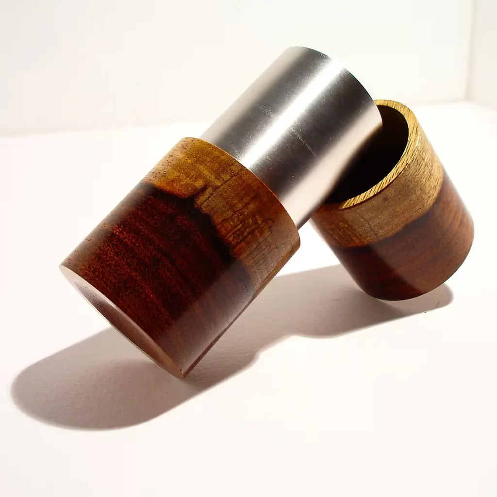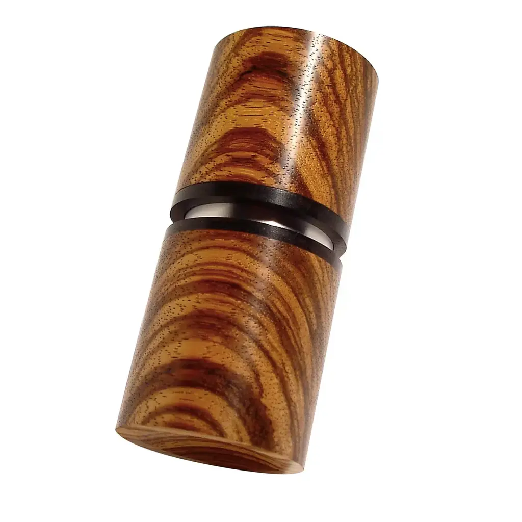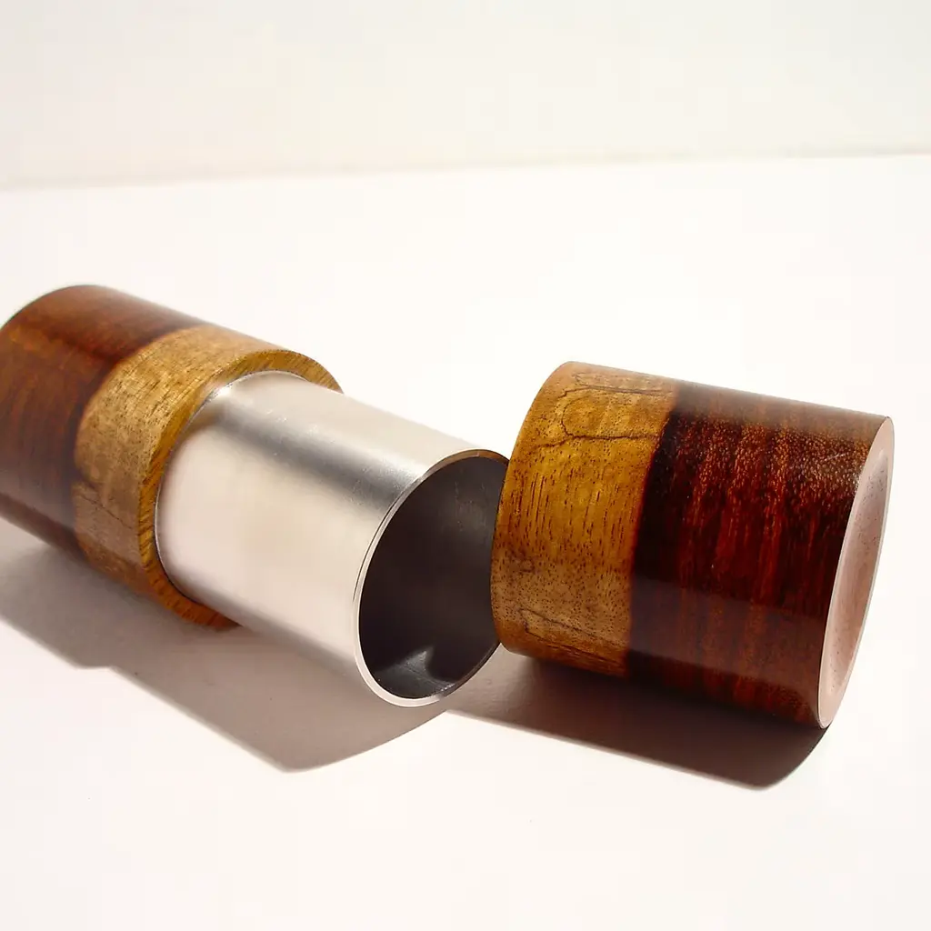 This refined spice holder is entirely handcrafted of Morado wood, a Brazilian exotic timber characterized by a reddish-orange heartwood with contrasting darker streaks and a pale yellow sapwood. Carefully worked on a lathe in a smooth and lustrous cylindrical shape, this piece features two identical halves enclosing an aluminum core designed to preserve the aroma of the spices.