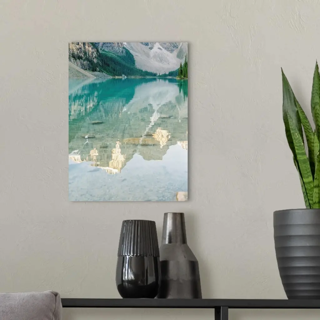 A photograph of mountains reflecting in the clear blue water of Moraine Lake, Banff National Park, Alberta, Canada.