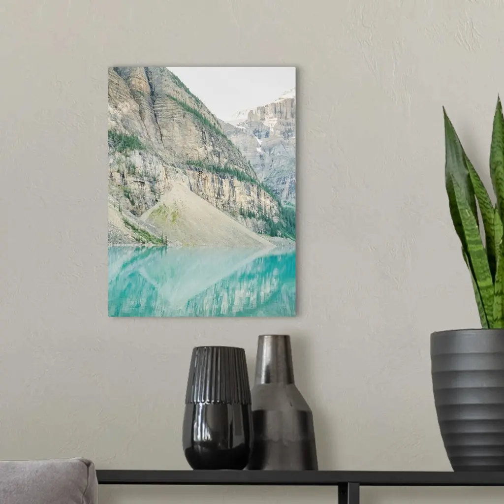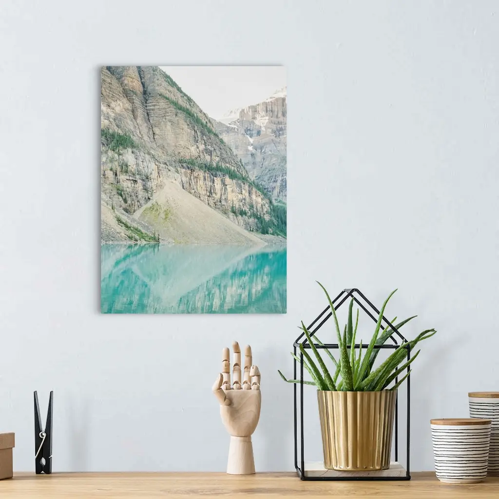A photograph of mountains reflecting in the clear blue water of Moraine Lake, Banff National Park, Alberta, Canada.