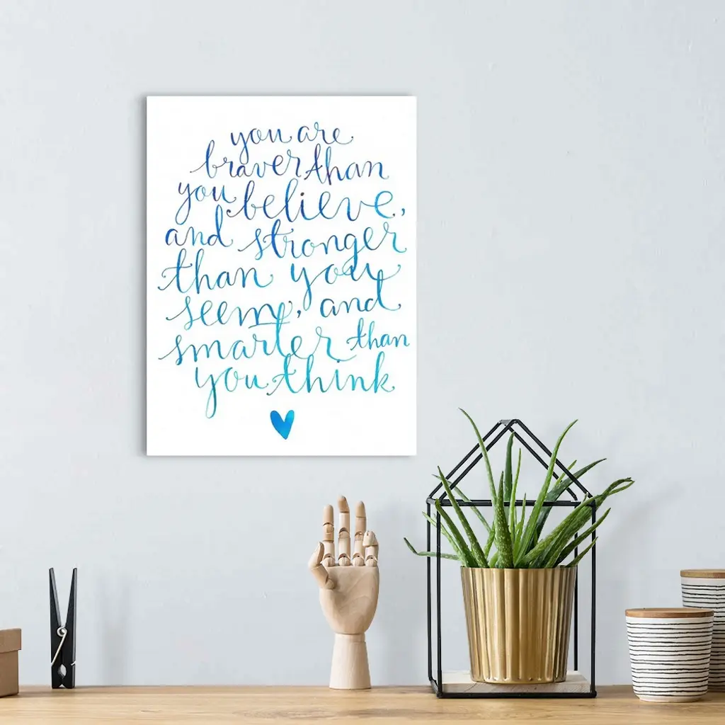 A handlettered inspirational quote about not underestimating your abilities done in varying shades of blue.