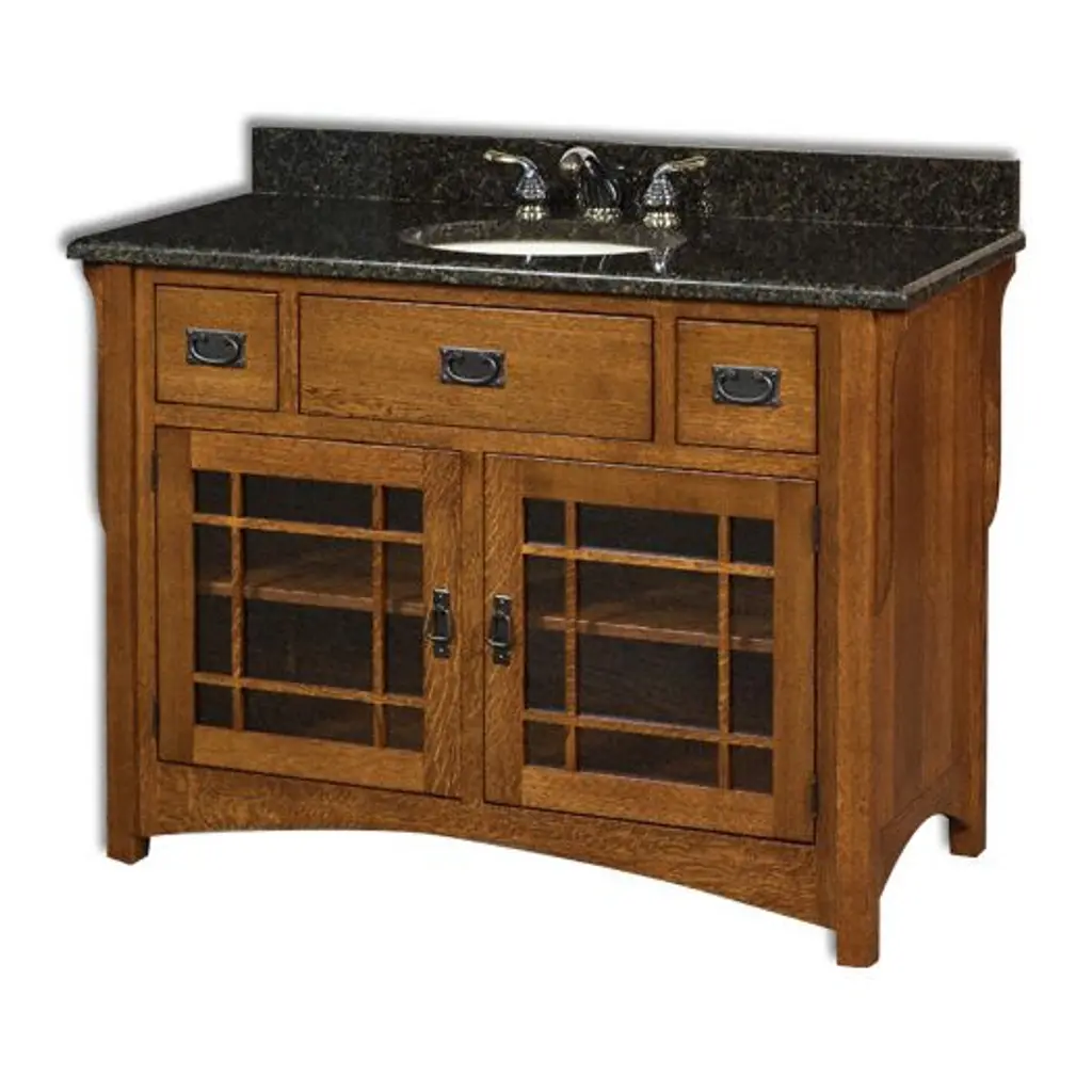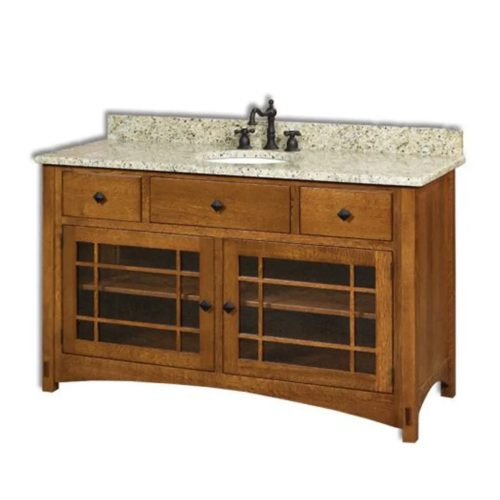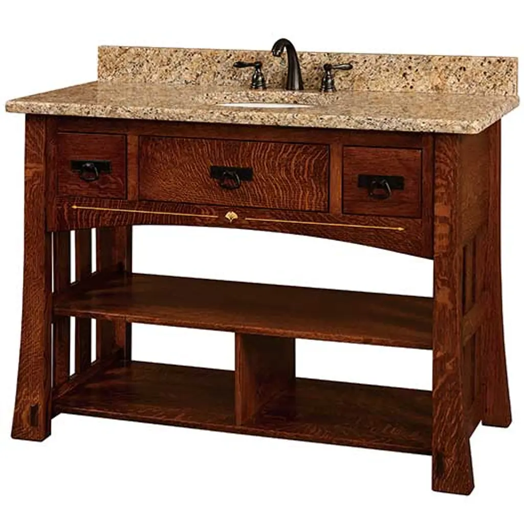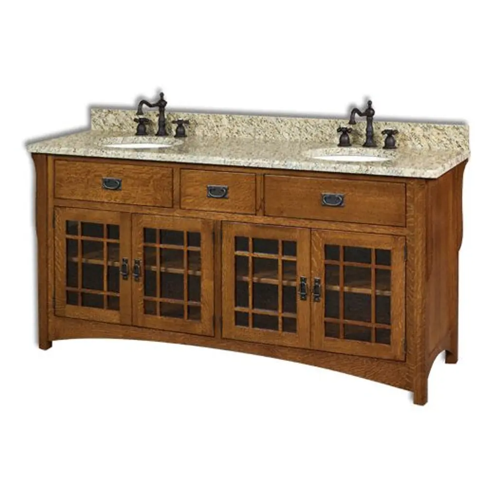 The Morgan 72" Vanity is an Arts and crafts Mission style piece featuring incredible Yellow heart wood ginkgo leaf and arrow inlays in the bottom shirt. Black period Mission hardware is the perfect finishing touch.