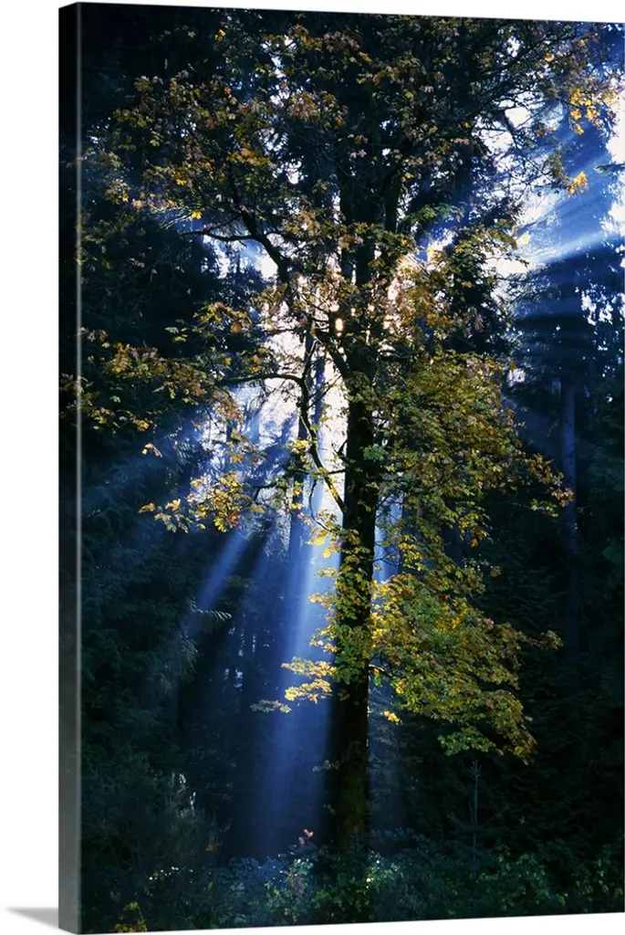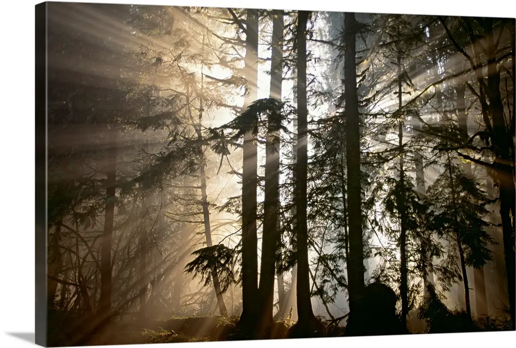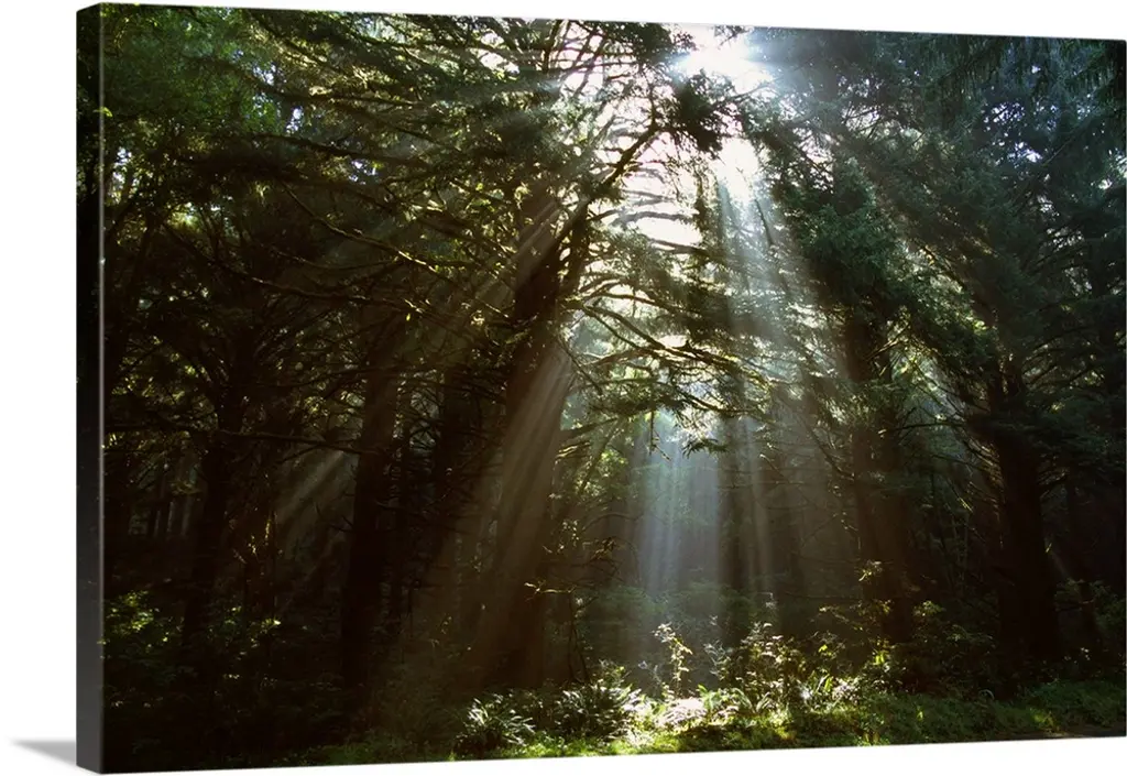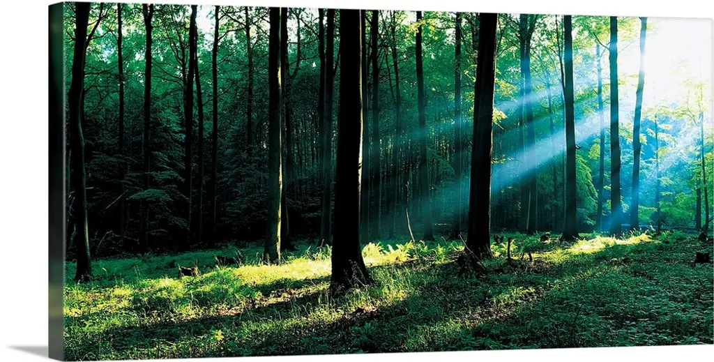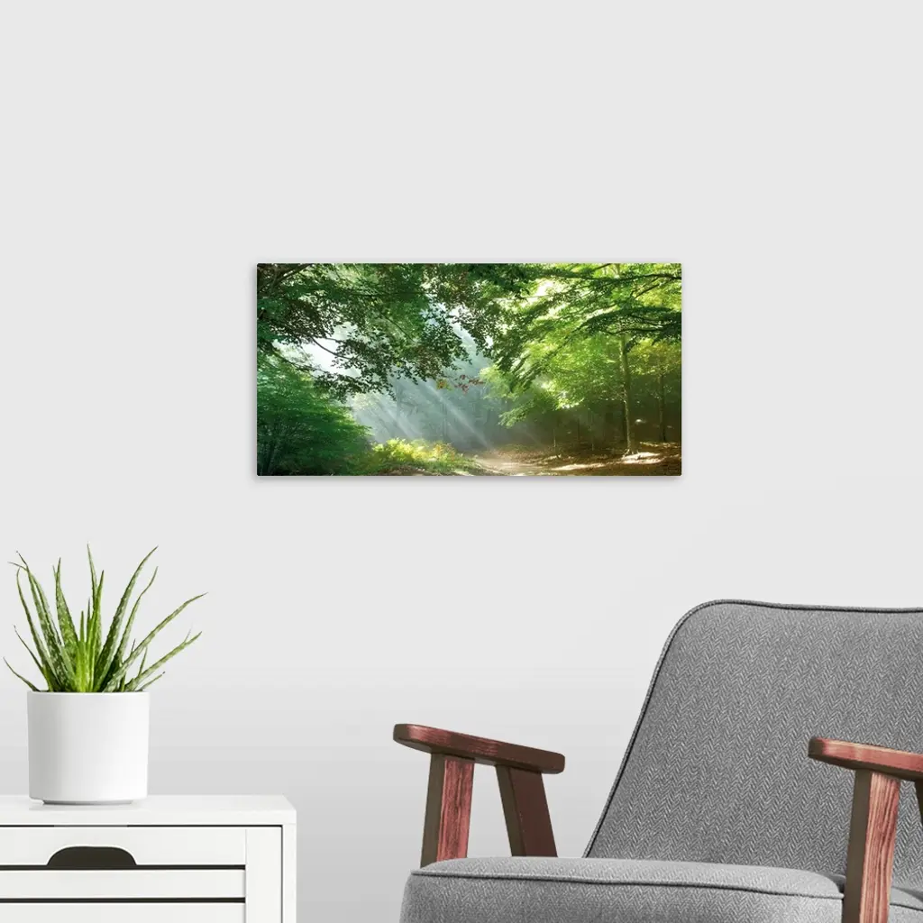A panoramic image of a trail through the forest with sun streaks peeping through the tree limbs.