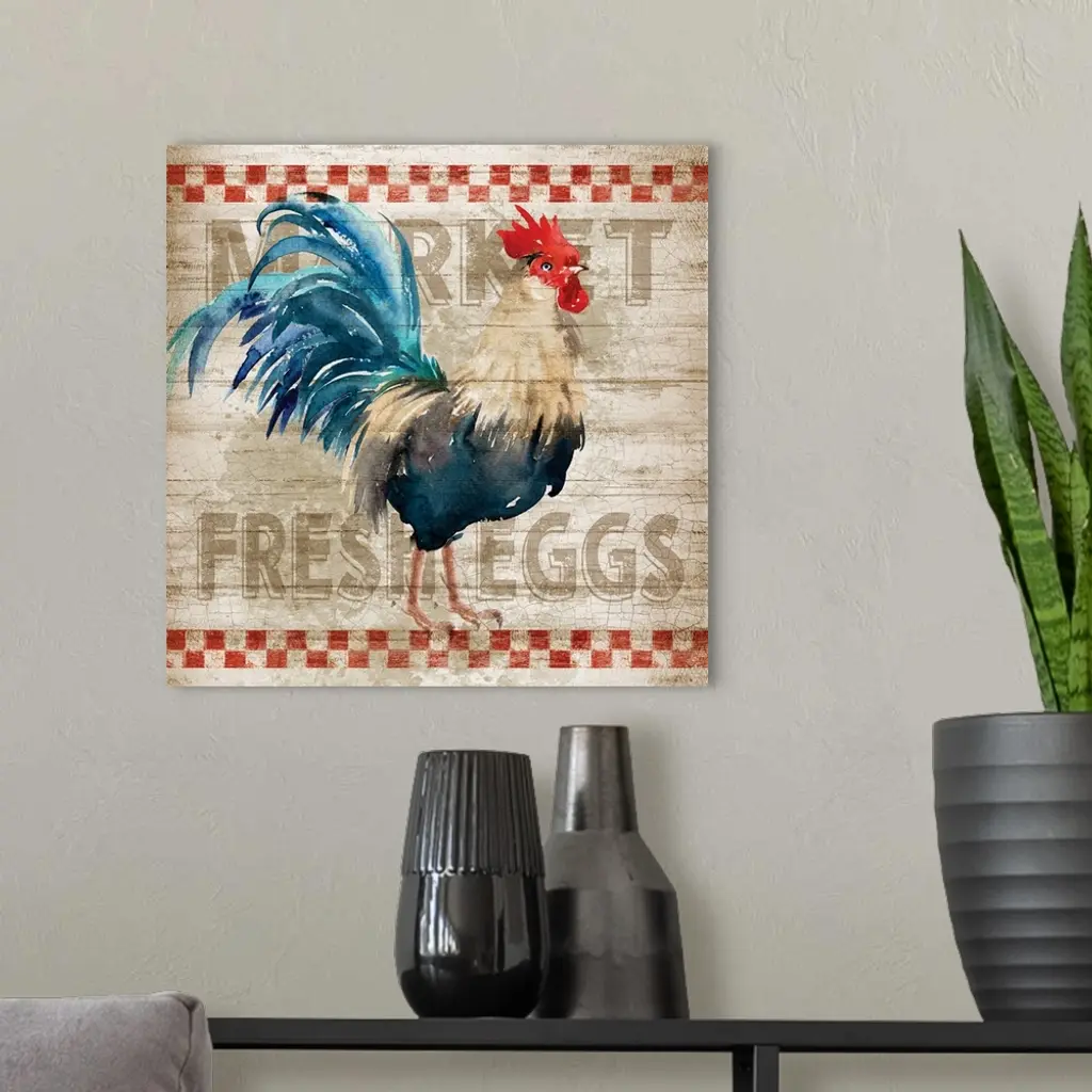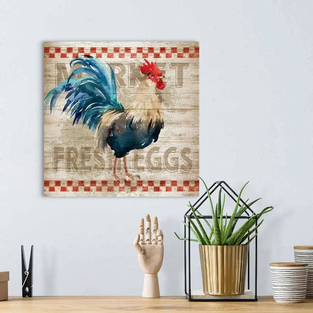 Square kitchen art with a watercolor rooster painted on a sign that reads "Market Fresh Eggs" in the background.