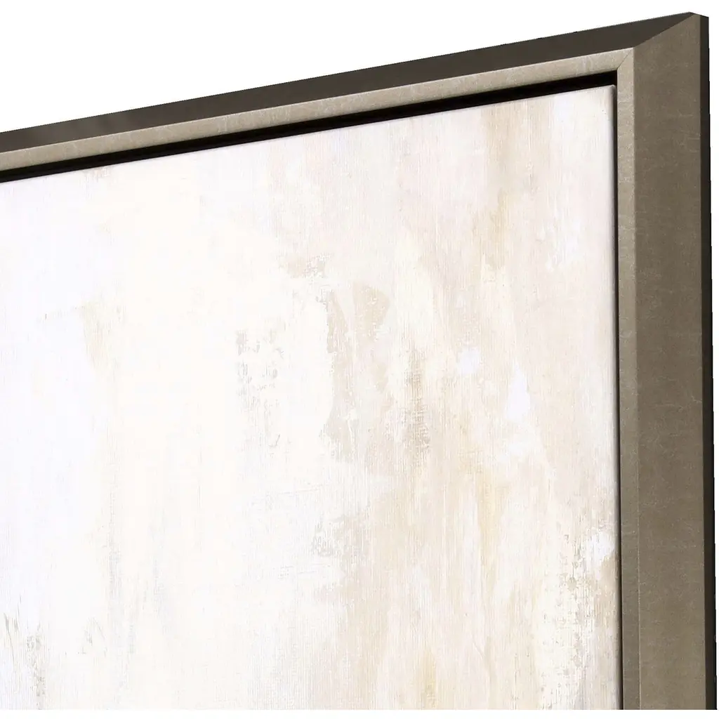 An abstract landscape is bathed in morning light. Canvas is mounted in a champagne gold finish floater frame.