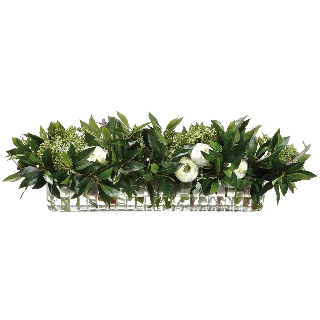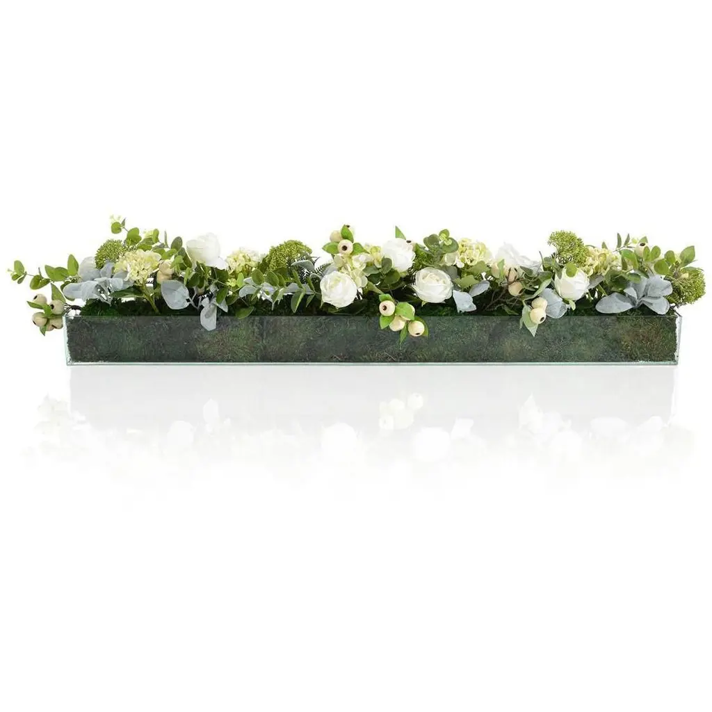 Very long rectangular clear glass vase lined with preserved green mood moss filled with white & green roses and hydrangeas.