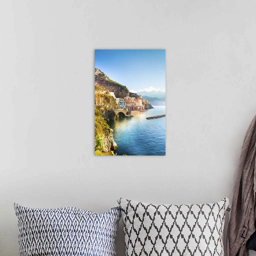 Morning view of Amalfi cityscape on coast line of mediterranean sea, Italy.