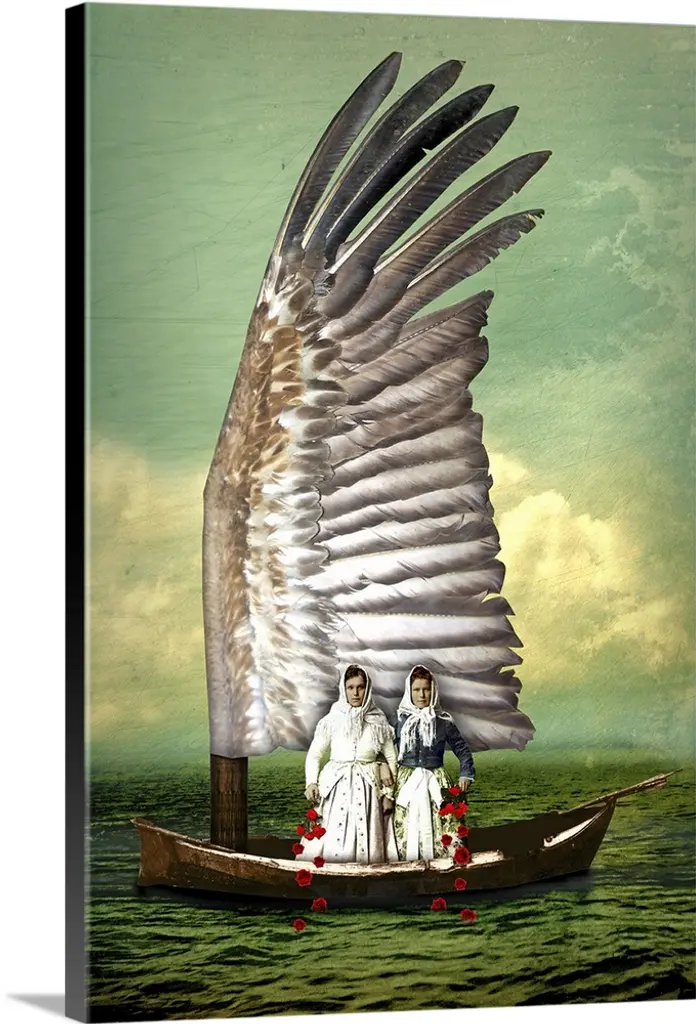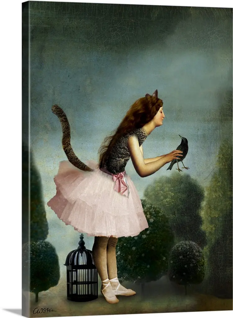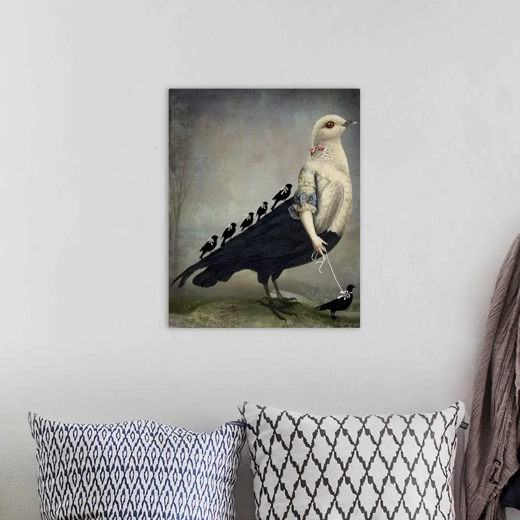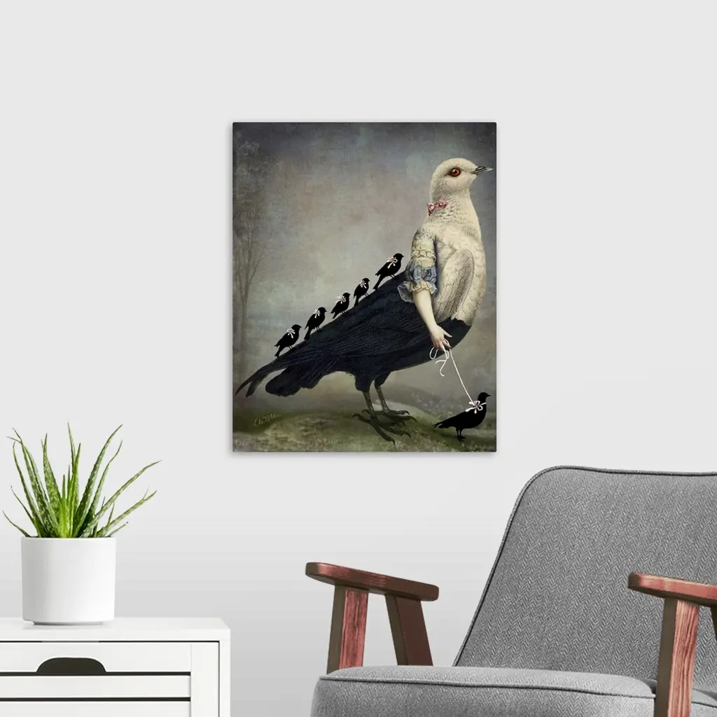 A large bird with human arms is walking a small black bird while a group of birds are riding on the back.