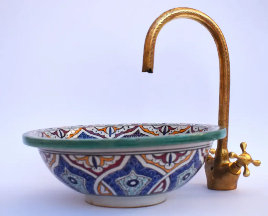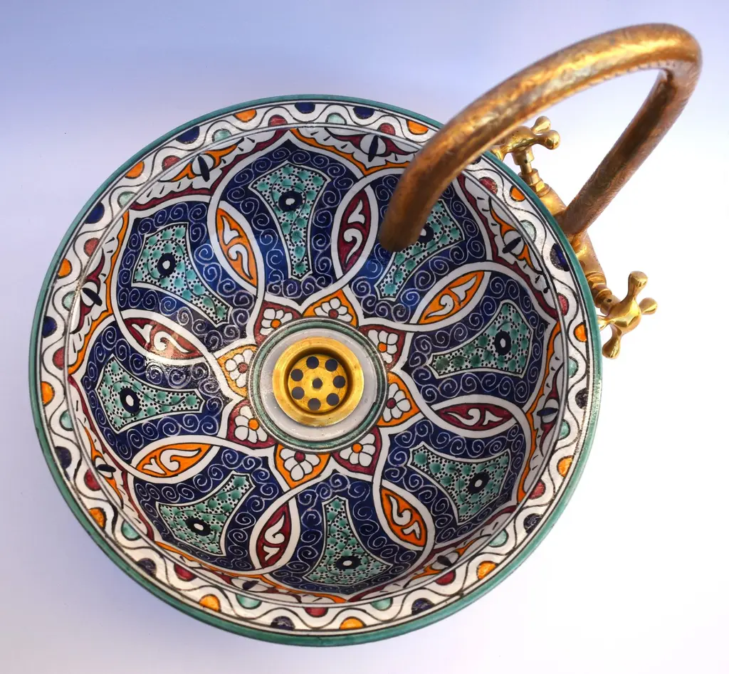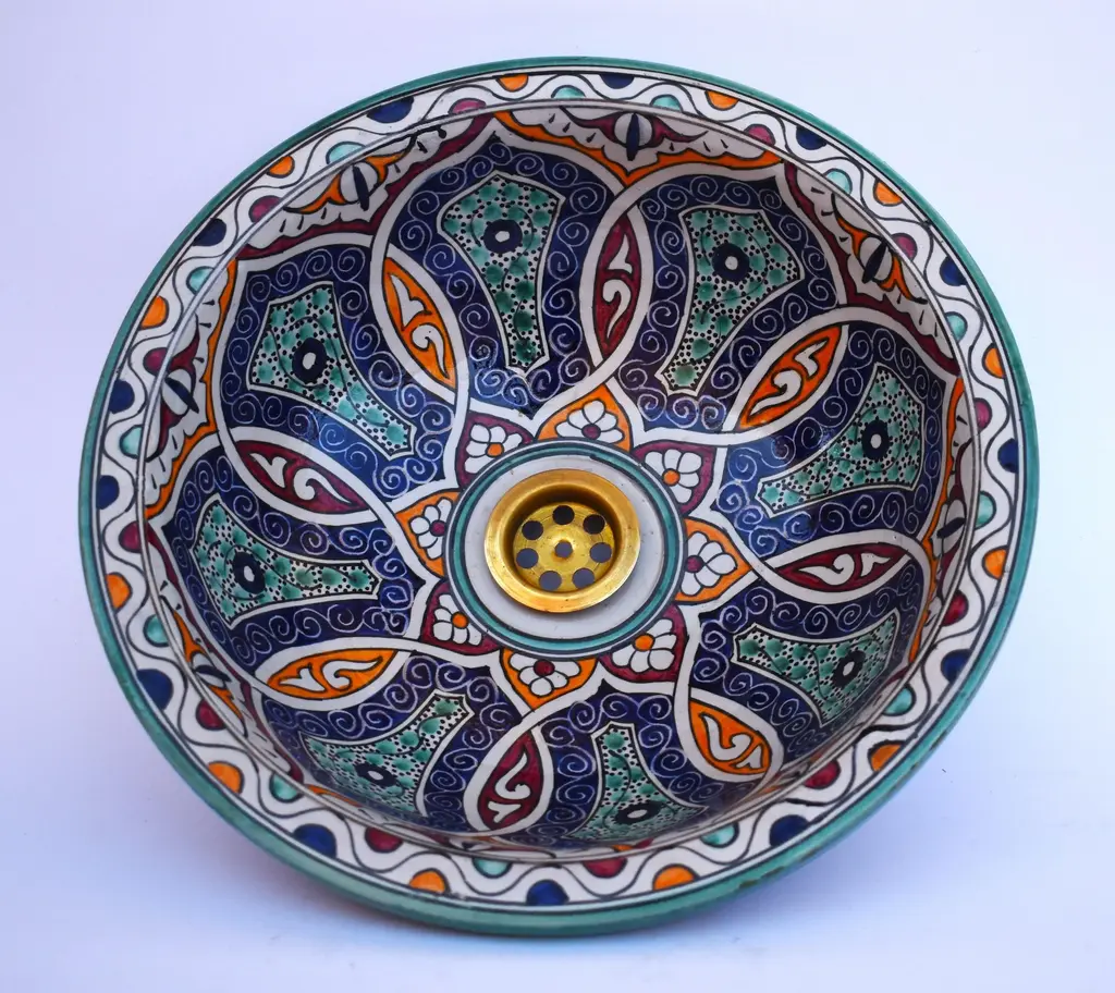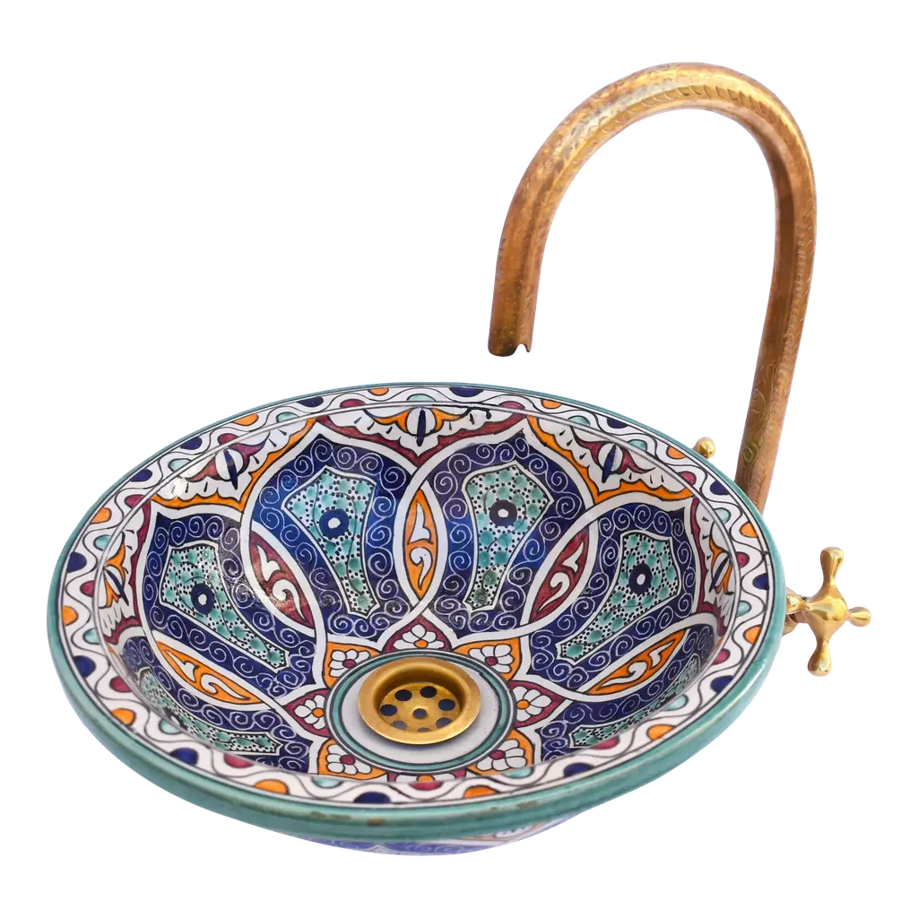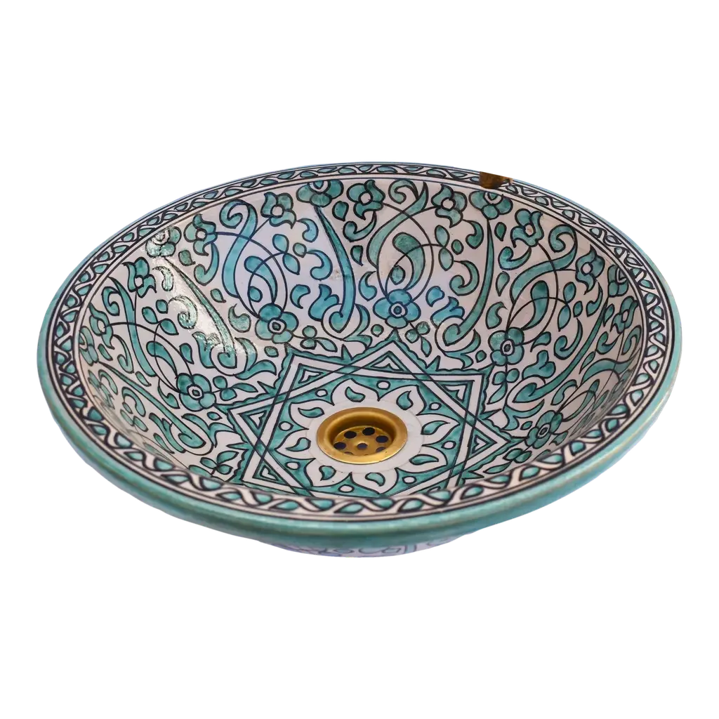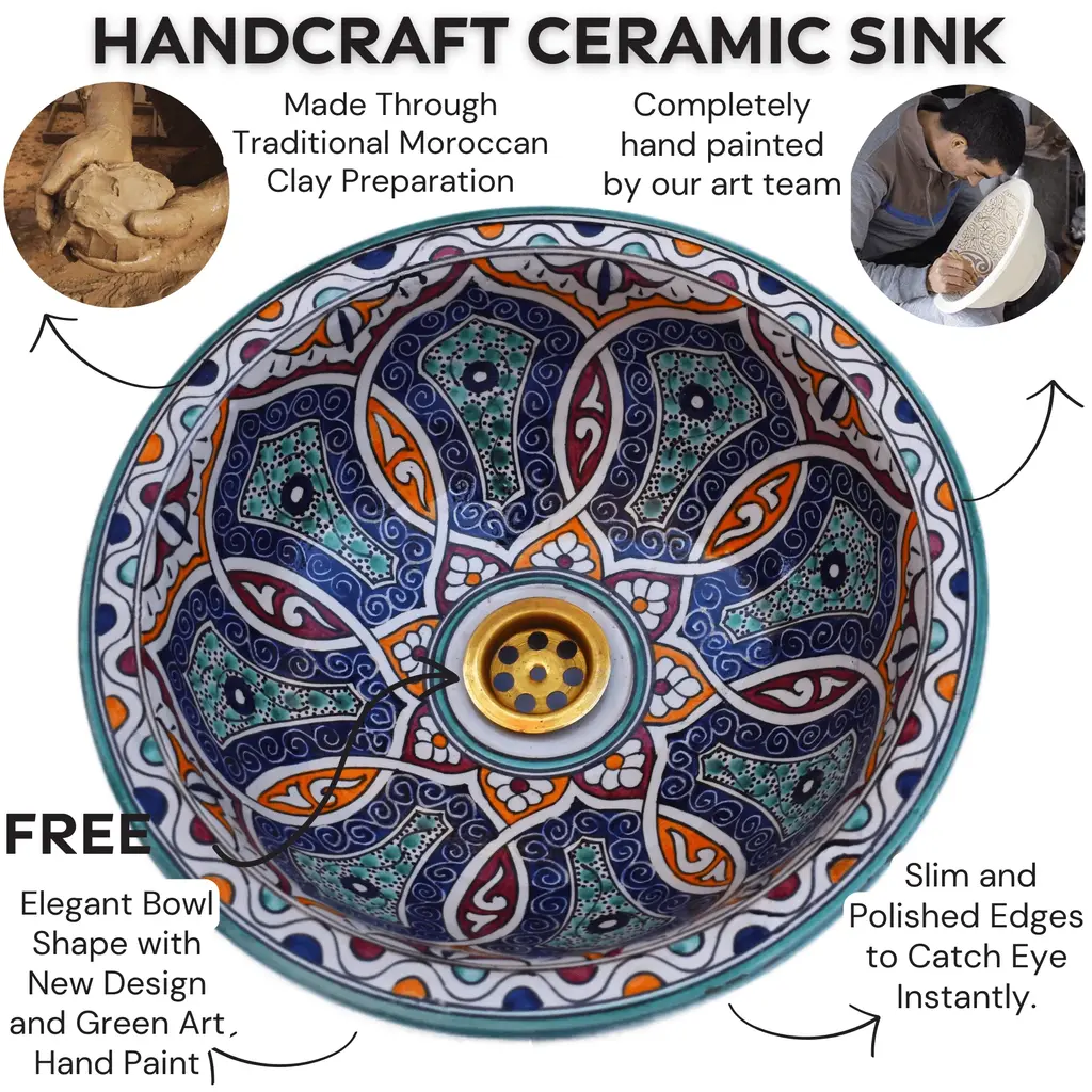 Exquisite Moroccan Round Vessel Sink, a true masterpiece crafted from premium ceramic and adorned with a captivating Moroccan Traditional motif. Meticulously hand-painted by our skilled Moroccan craft team, this unique sink is a perfect fusion of artistry and functionality. The vessel sink features a thick rim, adding both durability and aesthetic appeal to your bathroom. Its versatile design allows for easy installation as a drop in sink or above counter installation, giving you the flexibility to achieve the desired look for your space. Elevate your bathroom with the allure of Moroccan design, bringing a touch of timeless elegance to your home. This mini bathroom sink is not only a functional essential but also a statement piece that enhances the overall ambiance of your space. Crafted with care, this farmhouse sink embodies quality and style, creating a lavatory wash basin that stands out. The Moroccan Round Vessel Sink is not just a practical fixture, it's a stylish addition to your bathroom decor, effortlessly blending tradition with contemporary design Included with the sink is a free brass drain, providing a complete and cohesive look for your bathroom. The attention to detail and craftsmanship ensure a product of superior quality that will endure over time. ensuring that you receive a product that meets the highest standards of craftsmanship. Invest in the luxury of Moroccan-inspired design with our hand-painted vessel sink, a testament to the artistry and dedication embedded in each creation. Redefine your bathroom experience with this stylish and functional addition. Please note that due to the handcrafted nature of this sink, there may be slight variations in color and pattern, making each piece truly unique.