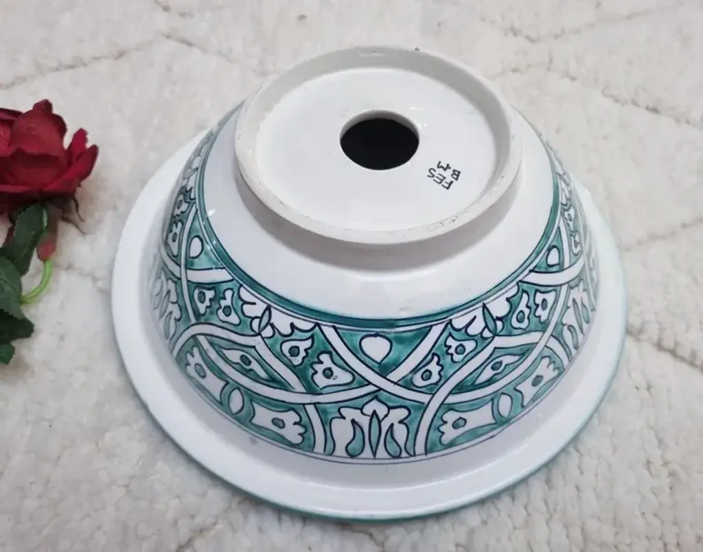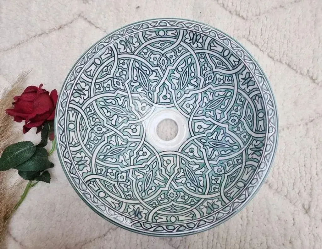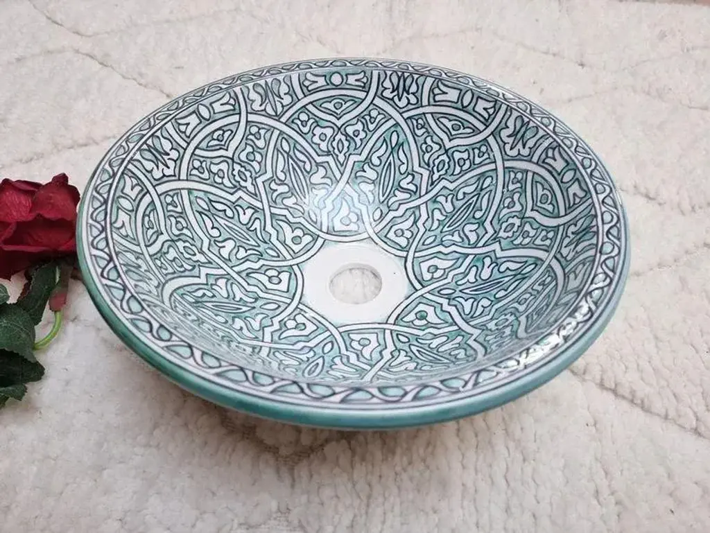 Welcome to ARTISANAT MARRAKECH shop for traditional Moroccan handicrafts Handmade Moroccan ceramic basins, where tradition meets sophistication. Immerse yourself in the rich cultural heritage of Morocco as you explore our meticulously designed aquariums, each one a testament to the skill and artistry of our talented artisans. Immerse yourself in the beauty of intricate designs and delicate craftsmanship, meticulously handcrafted to perfection. Our laundries are characterized by timeless elegance, blending traditional Moroccan motifs with contemporary flair. Handmade with care and attention to detail, these sinks are more than functional fixtures; they are pieces of art that elevate the ambiance of any bathroom or kitchen. Add a touch of exotic charm to your home decor with Moroccan ceramic sinks. Whether you are renovating your space or simply looking for an iconic piece, our collection offers a range of styles and sizes to suit your needs. Experience the allure of Moroccan handicrafts and turn your home into an elegant haven with the exquisite ceramic basins from ARTISANAT MARRAKECH. Measurements Diameter 25 cm 9,84252 inches Height about 16 cm 6,29921 inches The ceramic tub packaged in a bubble wrap with other packaging materials, is placed in a wooden box and is shredded. Please see all the pictures because they are part of the description, and ask any question before buying We offer free and fast shipping to all over the world.