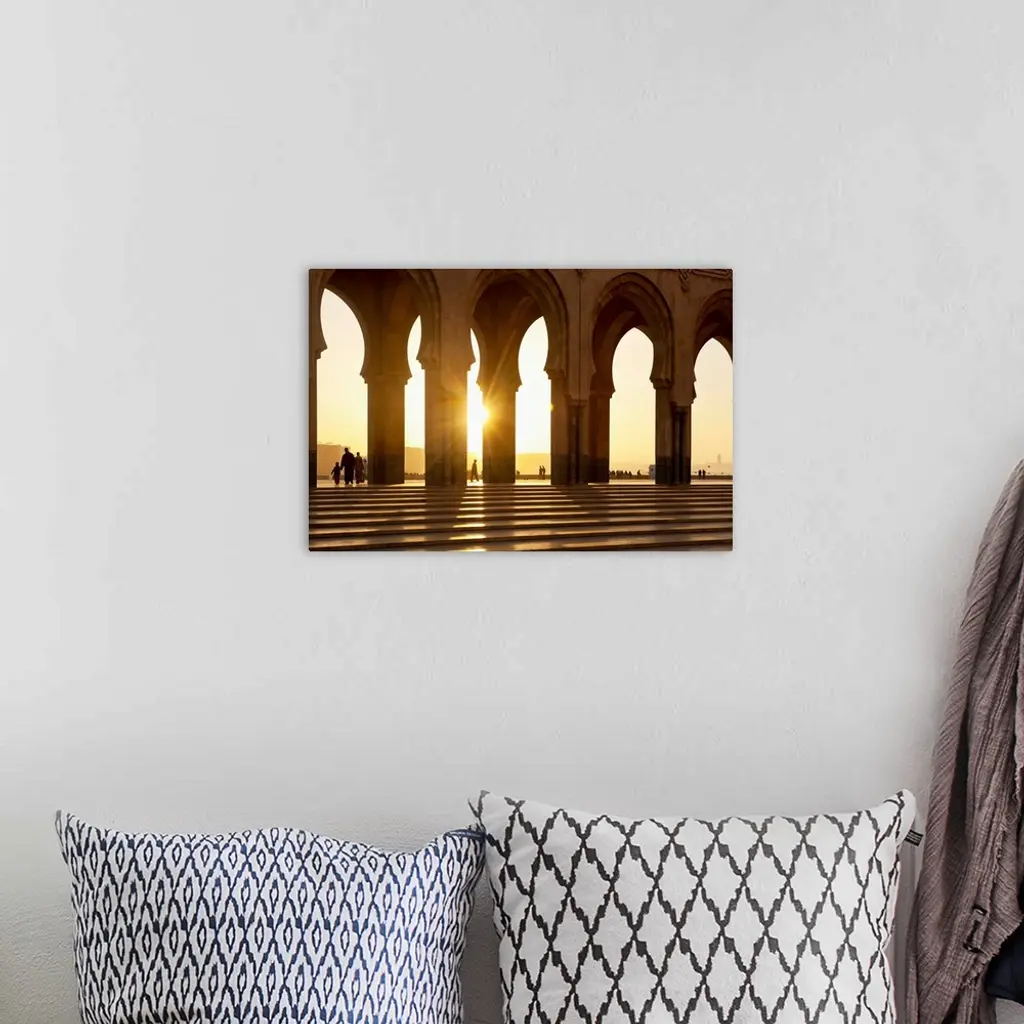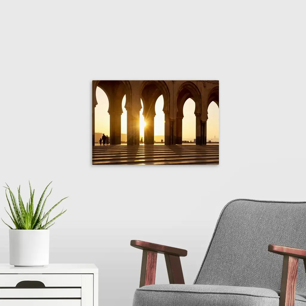 Morocco, Archways of Hassan II mosque at dusk, Casablanca wall art for home and office decor. Discover canvas art prints, photos, mural, big canvas art and framed wall art in GreatBigCanvas.com's varied collections.