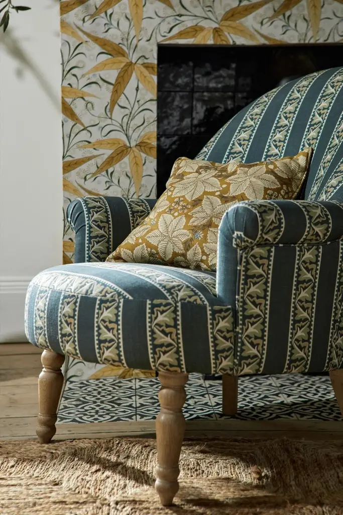 Adapted from the border of a carpet designed by Morris between 1881 and 1885 the Morris & Co. design studio has reworked the border as a modern fresh stripe with a classic Arts & Crafts touch. Redcar carpet is one of the largest known surviving examples of a Morris carpet with the Hammersmith mark. Inspired by traditional Chinese examples the scheme was originally woven with pastel colours on a camel-coloured ground. 50% Viscose 33% Cotton 11% Linen 6% Polyester. Sold by the yard. Part of the The Little Book of Morris Collection. Vertical Repeat: 2.95275590551181 Horizontal Repeat: 4.52755905511811 Aftercare Codes: No Machine Wash - SDC / No Ble / No tumb / C Iron / Iron Rev / SDC (Spec) This item is non-refundable, but swatches are available for purchase. Colors can vary from screen to screen; we recommend ordering a swatch before placing your full size purchase. For any questions, please reach out to swatches@chairish.com