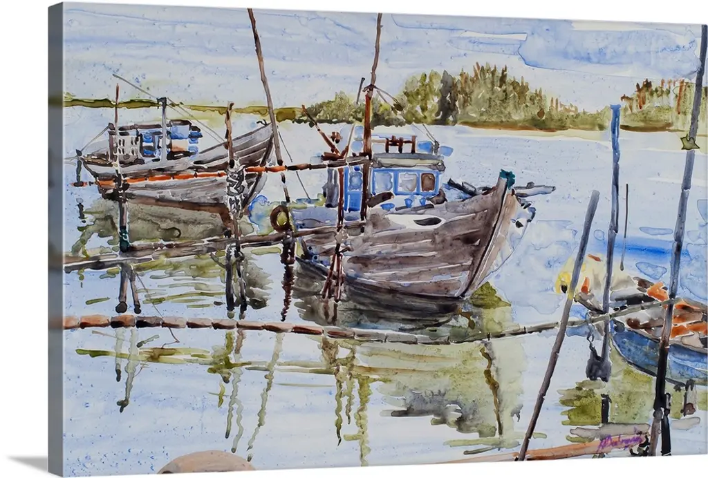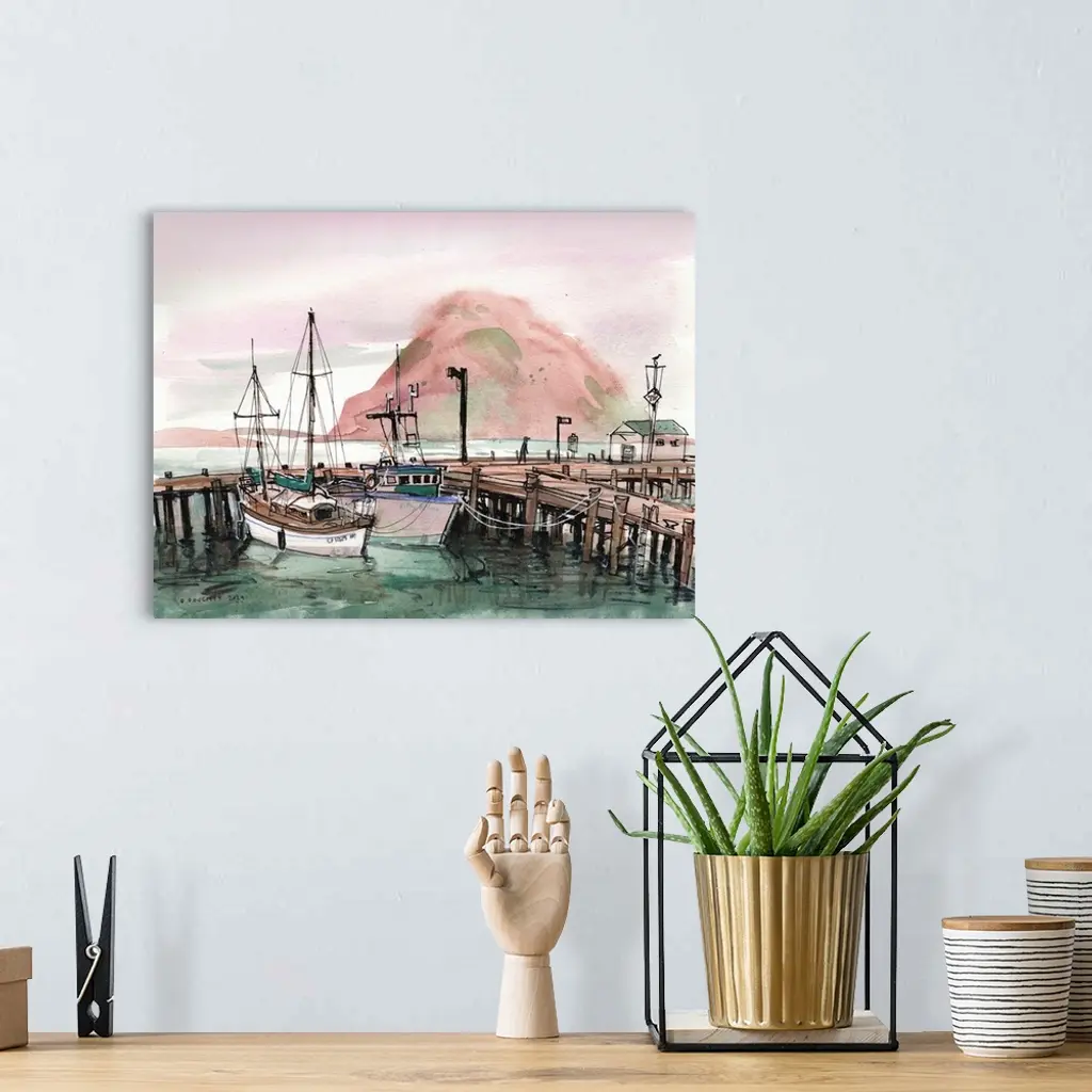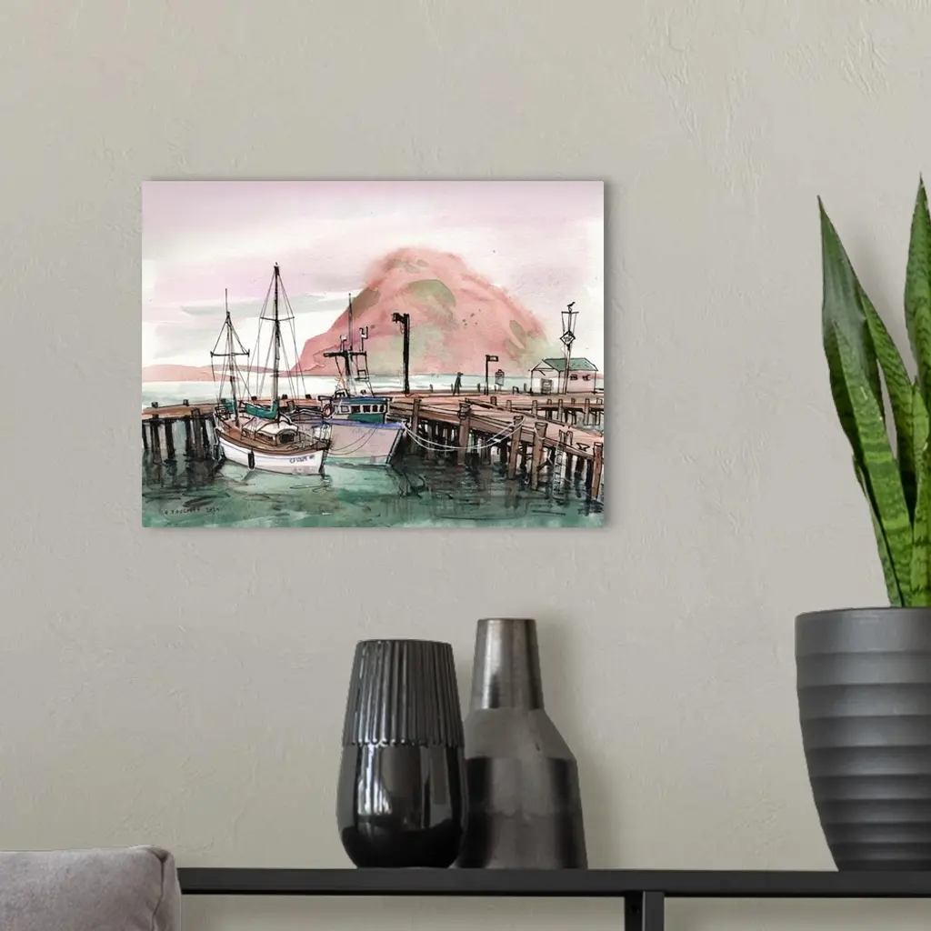 Boats tie up to a dock below the mist-covered Morro Rock in Central California on the Pacific Ocean.