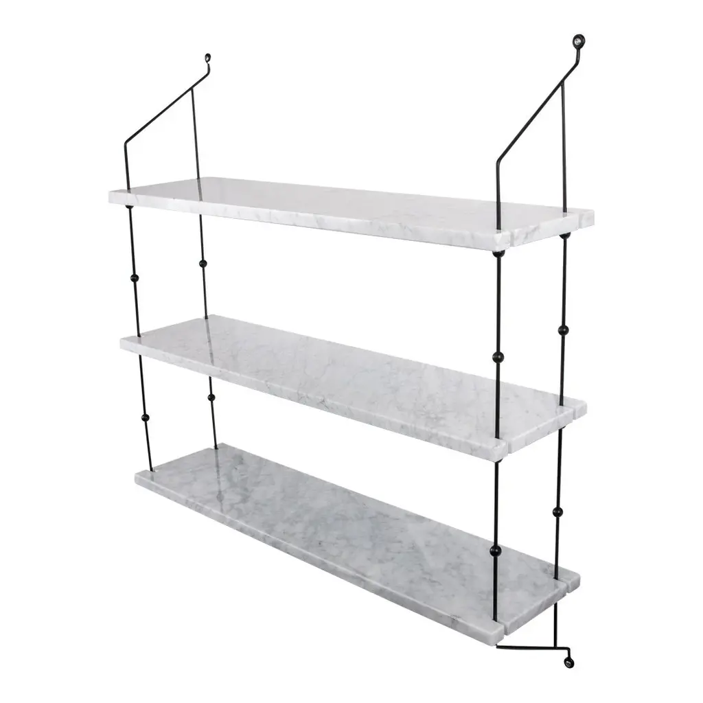 Frame made in powder coated steel or brass (steel with brass surface). Marble or wood shelves to be inserted in the metal frame. Shelves in White Carrara, Black Marquina, Green Indio or Sand Travertino will exhibit natural variations in terms of colour, drawings and patterns characteristic for each type of marble. The backside of the shelves will have an unpolished surface. As for White Carrara, small cracks can sometimes be found on the polished surface. This phenomenon known as “taroli" is a natural characteristic of the stone, which cannot be eliminated completely.