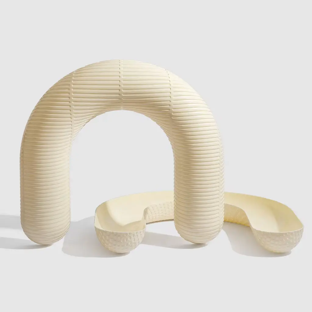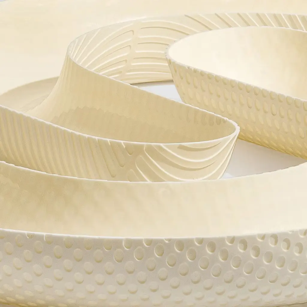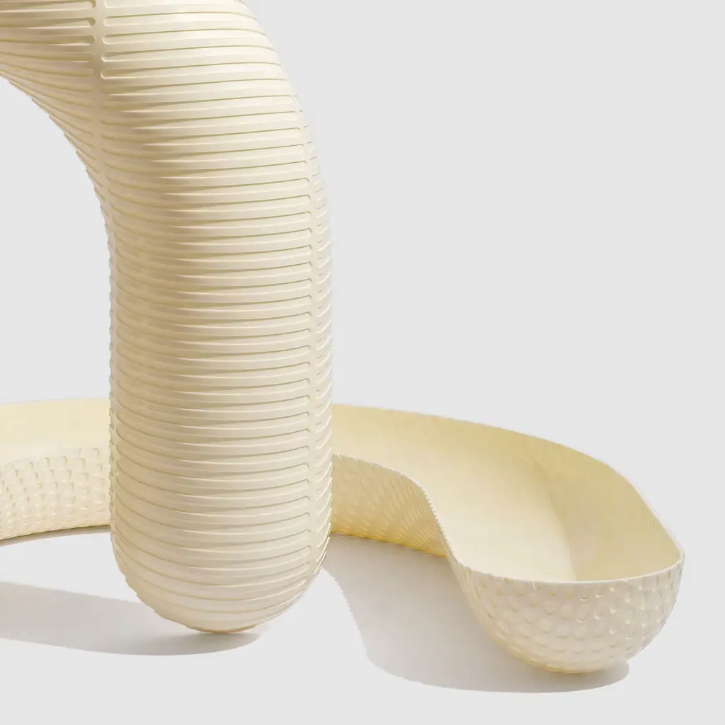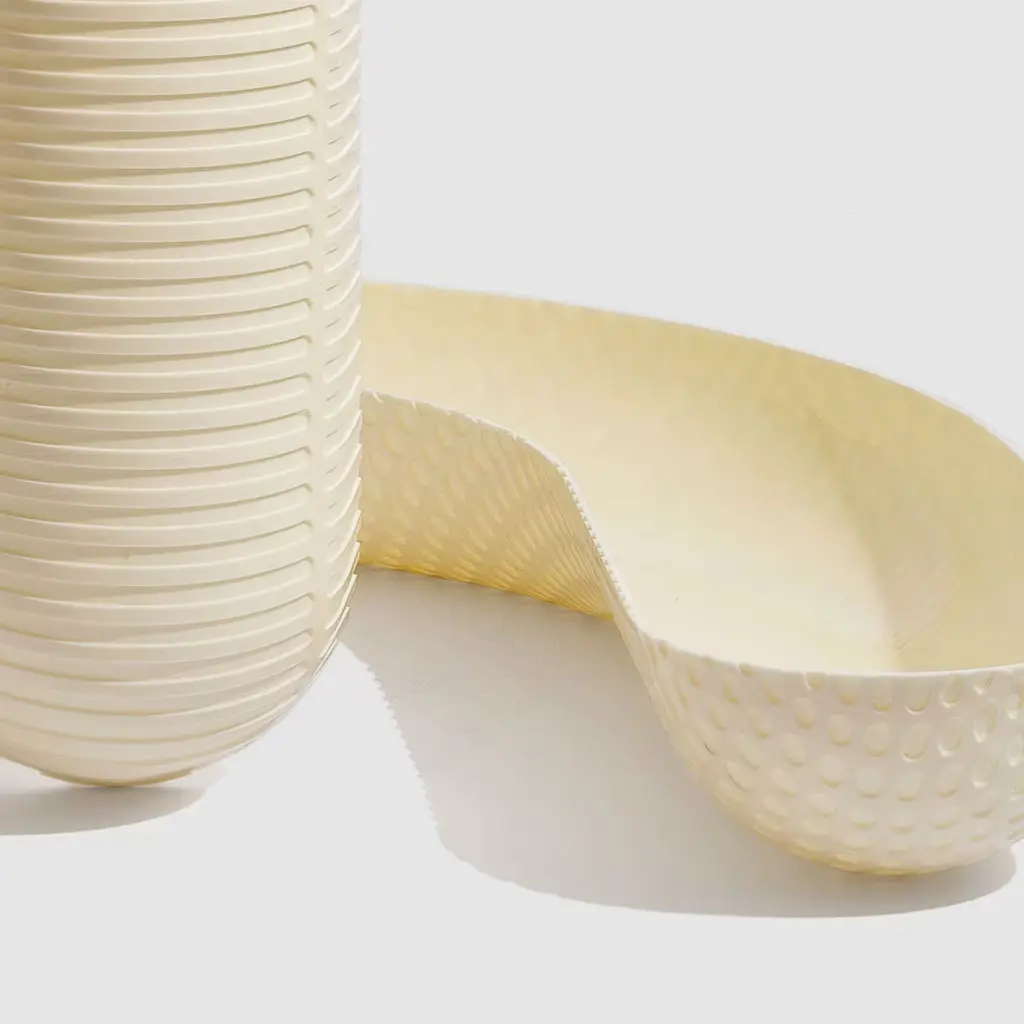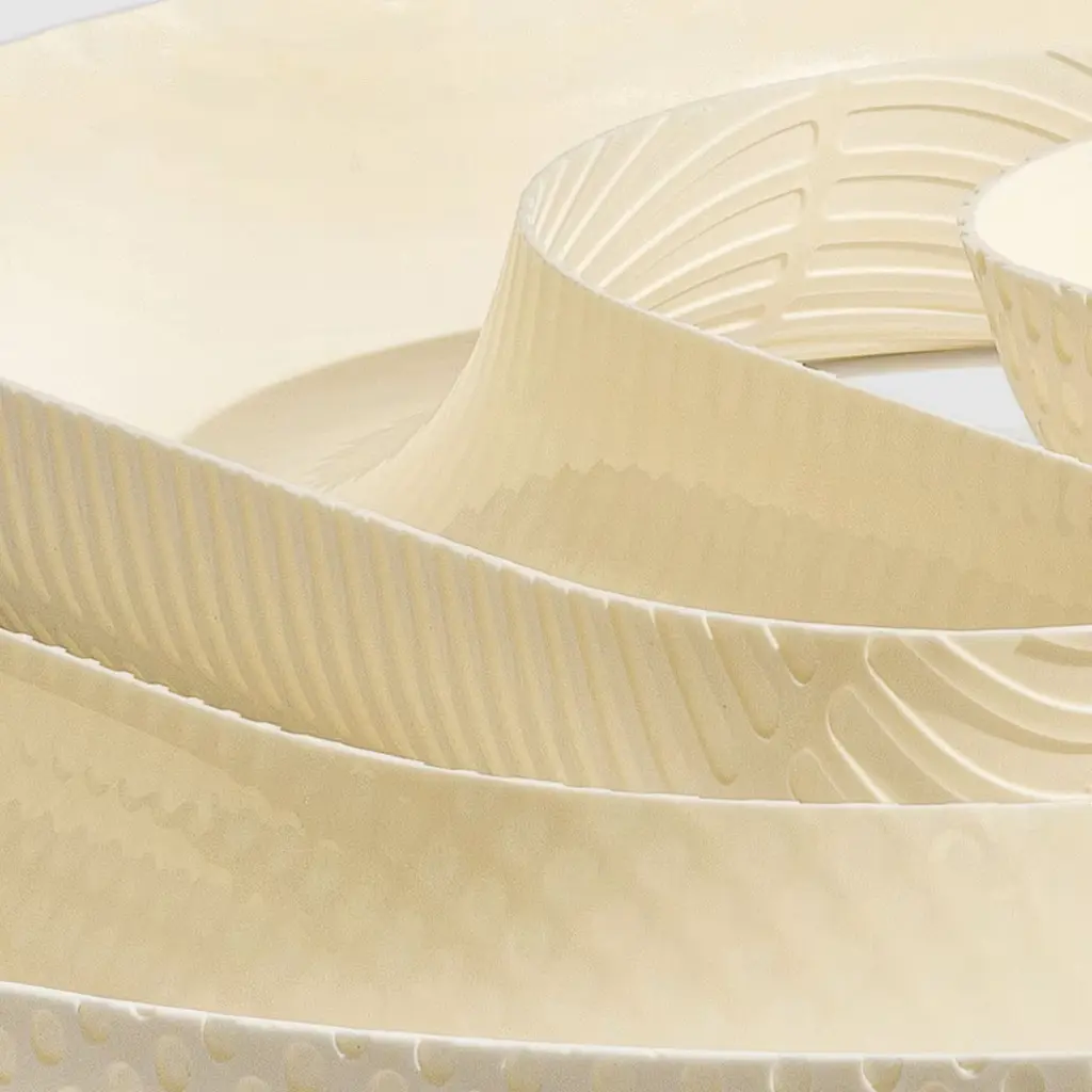Inspired by the design of Ugo La Pietra. A simple shape, featuring two distinctive tracts: a line and a dot, generating a pair of tableware decorations, similar but unique. The finished product reminds of the sinuous, recurring shapes so popular in those years, where the presence of a random disturbance overlaps and deforms the perceptual structure of the object. A pragmatic distortion that occurs thanks to object overlapping effects, and by clever juxtaposition, creating endless combinations.