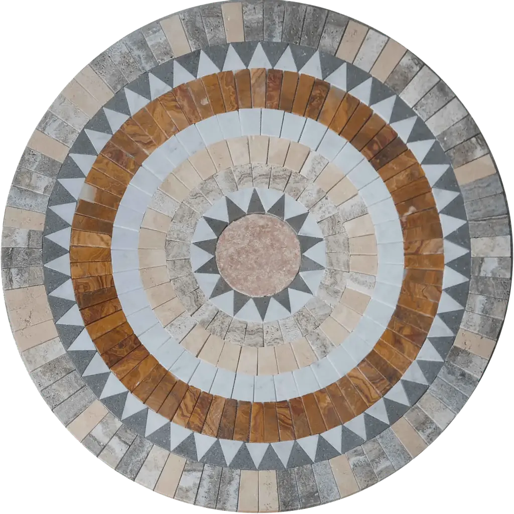 Introducing the Mosaic Accent - Kaleidoscope, a stunning and unique addition to your home decor that combines artistry and craftsmanship seamlessly. This exquisite piece features a captivating kaleidoscopic mosaic medallion design, tailor-made for enhancing the beauty of your floors. Each Mosaic Accent - Kaleidoscope is meticulously handmade, showcasing the intricate process of blending vibrant colors of marble and natural stones. The result is a breathtaking mosaic pattern that not only elevates your interior design but also tells a story of artistry and dedication. With its vibrant hues and stunning geometric shapes, this mosaic medallion transforms any space into a visual masterpiece.Ideal for living rooms, entryways, or any area that deserves a touch of elegance, the Mosaic Accent - Kaleidoscope serves as a focal point that draws the eye and enchants every visitor. The intricate details and rich textures of the natural stones create a dynamic interplay of light, making your floors come alive with beauty.Whether you're renovating your home or looking to add a unique accent to your decor, the Mosaic Accent - Kaleidoscope is perfect for those who appreciate high-quality craftsmanship and distinctive design. Its versatility allows it to complement various decor styles, from modern and contemporary to classic and rustic.Enhance your living space with the unmatched charm of the Mosaic Accent - Kaleidoscope. Immerse yourself in a world of color and texture, and let this mosaic medallion be the statement piece that transforms your floors into an artistic canvas. Elevate your home decor today with this exquisite handcrafted masterpiece.