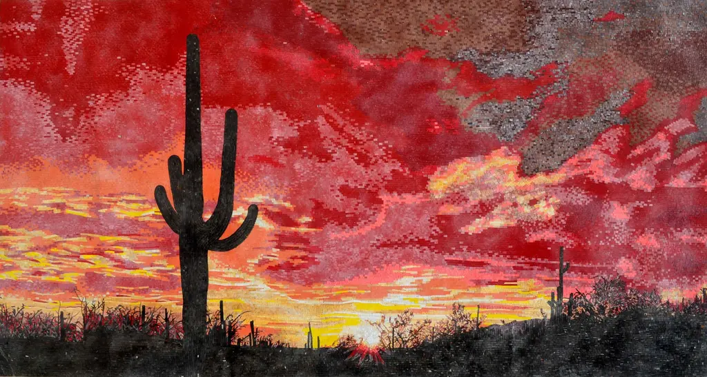 Immerse yourself in the breathtaking beauty of the Arizona landscape with our exquisite Mosaic Art - Red Sunset Sky in Arizona. This stunning piece of handcrafted art transforms the captivating essence of a vibrant Arizona sunset into an eye-catching masterpiece for your home or office. Each mosaic tile is meticulously placed to create a harmonious blend of colors that evoke the feeling of a warm evening in the desert. Brilliant yellow hues serve as a striking backdrop, symbolizing the clear, expansive arid sky that the region is known for. Meanwhile, the vivid tones of red, orange, and black pay homage to the rich cultural heritage of Native American artistry, weaving a story of tradition and nature into every square inch. What truly elevates this mosaic is the inclusion of luminous brown quartz, radiant dark red quartz, and shimmering light red quartz. These exquisite stones bring a prismatic, jewel-like brilliance to the piece, creating scintillating accents that capture and reflect light with translucent brilliance and captivating depth. The brown quartz adds an earthy, warm glow, while the dark red quartz provides intense, crystalline richness, and the light red quartz offers a delicate, radiant shimmer that enhances the overall composition. Crafted with passion and precision from premium quality natural stone and exotic materials, this work of art encapsulates the thrill of Arizona’s landscapes and will surely become a conversation starter. The detailed craftsmanship ensures that each piece presents depth and texture, offering a visual experience that changes with the light and perspective. Perfect for those who appreciate unique artistry and want to bring a slice of Arizona’s natural wonder into their everyday lives, this mosaic is ideal for any space—be it your living room, hallway, or an art gallery. Elevate your space and experience the allure of the Southwest with our Mosaic Art - Red Sunset Sky in Arizona. Celebrate the unique blend of nature and art, and let this masterpiece inspire you every day. Whether you're an art collector or simply looking to add a touch of elegance to your decor, this luxury stone mosaic promises to captivate hearts and minds alike.