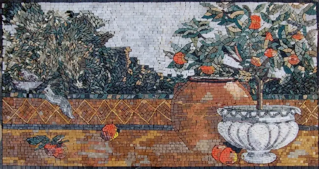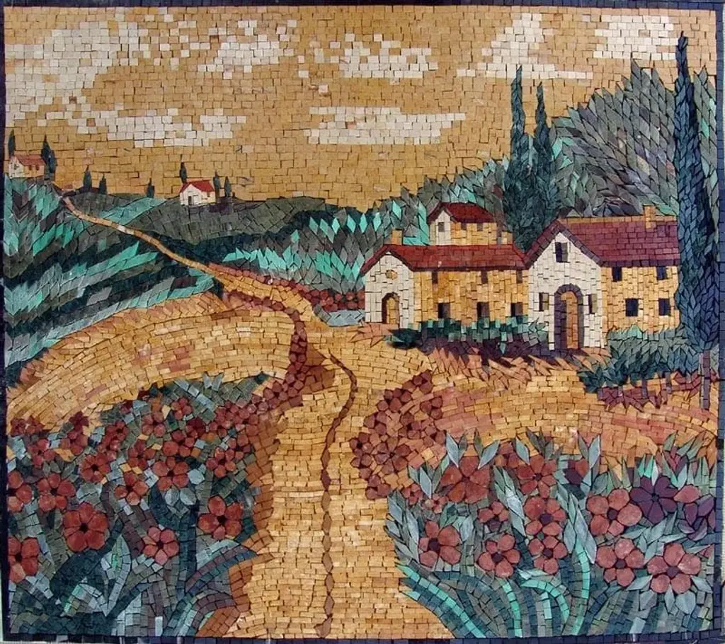 We can see an appetizing breakfast set on the table with a beautiful scenery of wheat fieldsfrom the window behind. This mosaic makes a great option for Kitchen wall art or as a backsplash.