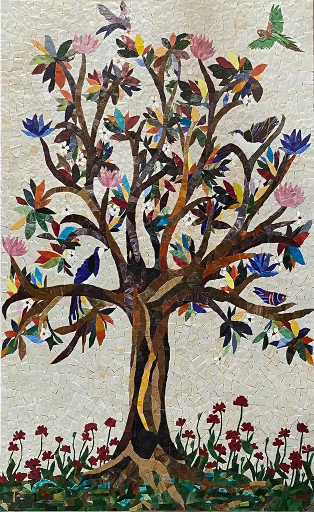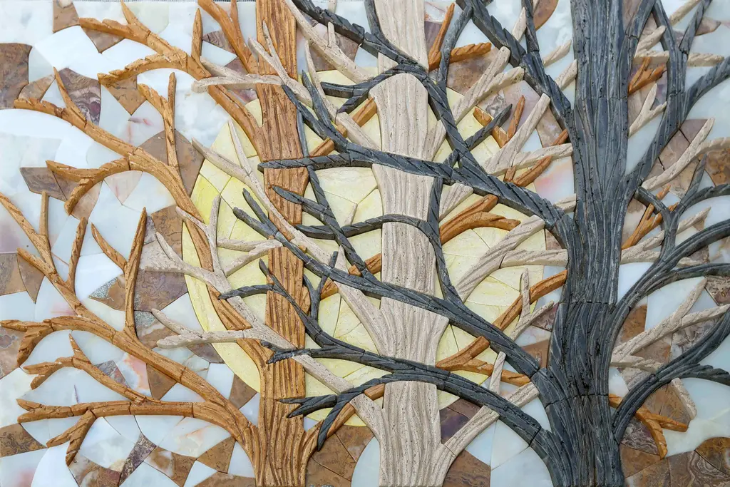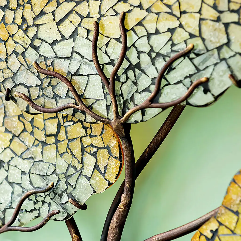 Leaf your troubles behind! This Mosaic Tree Wall Décor exudes serenity and beauty, adding soothing ambiance wherever you choose to place it Shards of yellow and clear glass are artfully placed to create a mosaic effect of the tree leaves. Held together by a bronze-finished metal trunk and branches, the tree adds a unique touch to any room. It can be used as the perfect statement piece in any display. Hanging and display are made easy with the sturdy keyhole anchors along the back.