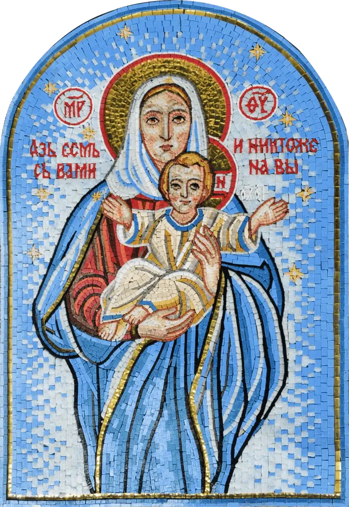Introducing our exquisite Mosaic Virgin Mary Holding Baby Jesus Religious Icon, a stunning piece of art that beautifully encapsulates the essence of maternal love and divine grace. This arc-shaped religious mosaic is meticulously crafted to showcase the tender moment between the Virgin Mary and her beloved son, Baby Jesus. Handcrafted with care, every detail is painstakingly designed to create a masterpiece that not only enhances the spiritual ambiance of any space but also serves as a celebration of faith and devotion.The vibrant hues of blue dominate the mosaic, symbolizing the purity and innocence of the Virgin Mary. Her flowing cape, rendered in this serene shade, envelops her with grace while subtly highlighting her traditional red attire and a delicate white veil underneath. This exquisite interplay of color represents Mary’s compassion and nurturing spirit, making the piece a perfect addition to any religious or sacred setting.At the heart of this mosaic, Baby Jesus is depicted with open arms, a universal gesture of acceptance and love. His expression captures the essence of childhood innocence and divine purpose, inviting onlookers to feel the warmth and affection between mother and child. Surrounding them, a radiant halo crafted from shimmering gold tiles adds an ethereal glow, symbolizing holiness and reverence.This fully handmade detailed mosaic is not only a work of art but a meaningful representation of Christian faith, making it an ideal installation for churches, chapels, or even your home altar. Its unique design and rich symbolism make it a thoughtful gift for religious occasions, baptism, or as a cherished keepsake to inspire love and spirituality in daily life.Elevate your surroundings with this breathtaking religious icon, a piece that resonates with beauty and devotion, perfect for honoring the sacred relationship between Mary and Jesus. Bring this masterpiece into your life and let its inspiring presence serve as a constant reminder of love, faith, and familial bonds.