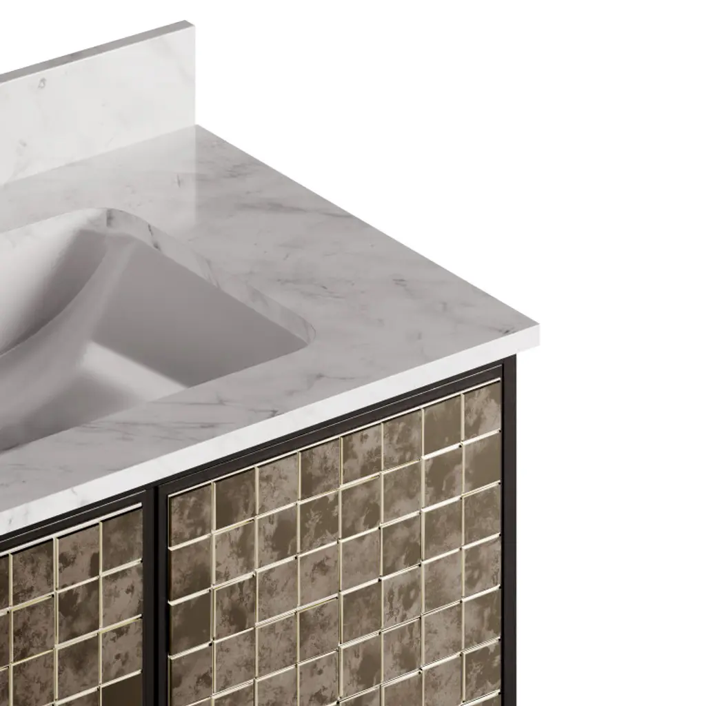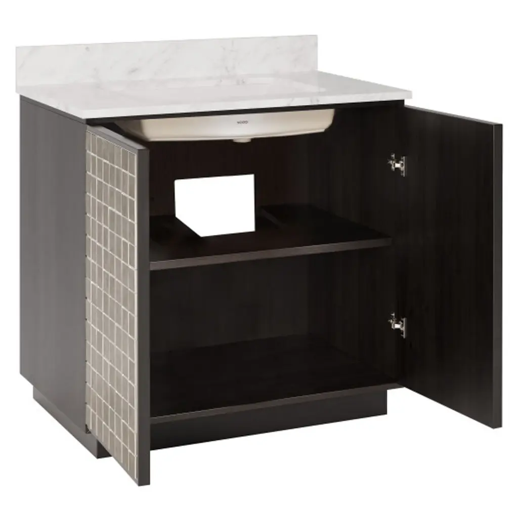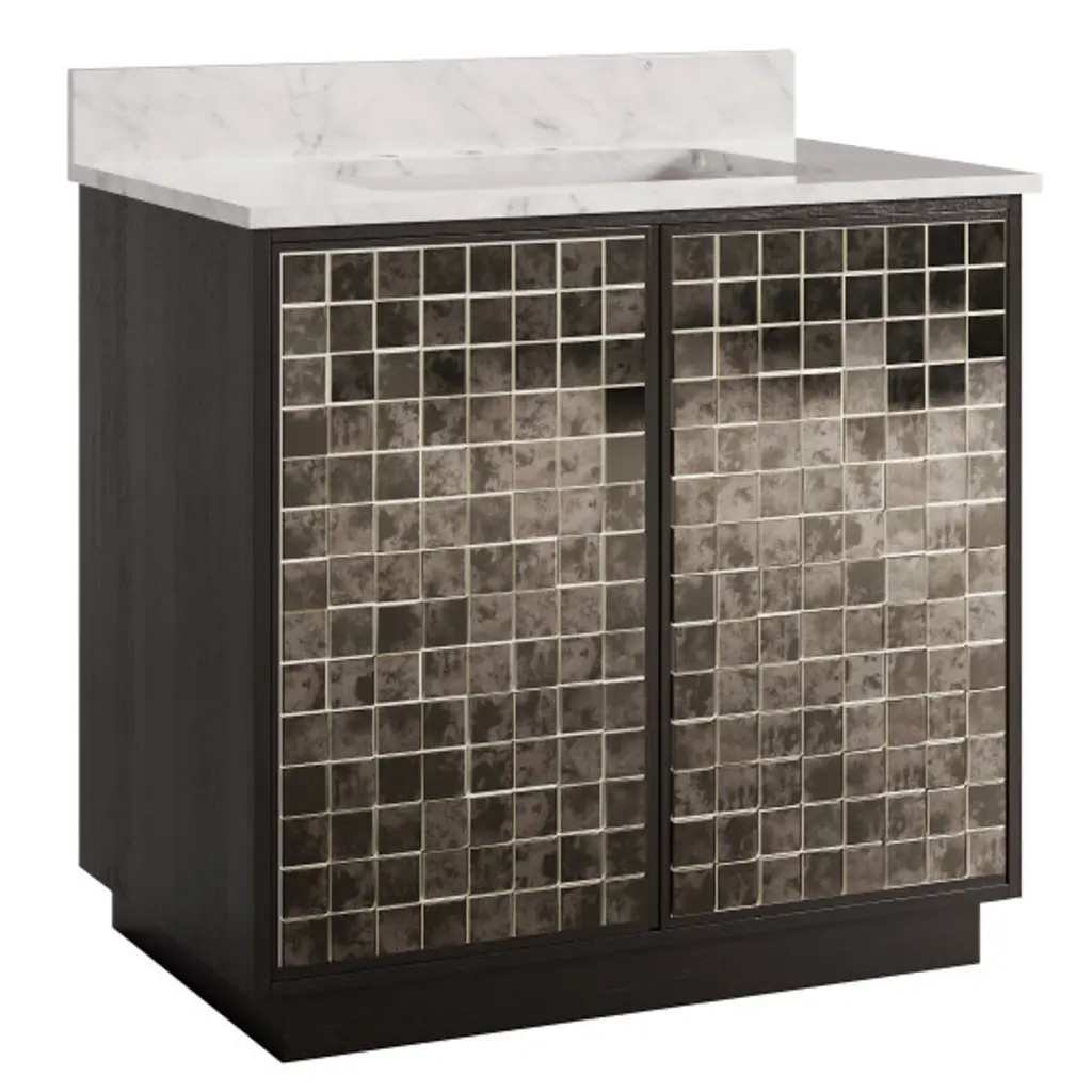 The striking Mosaico 36” Bath Vanity is an eye-catching piece that features doors covered in a mosaic of antique mirror tiles, each one hand-placed into a black-painted mango wood frame for an artisanal feel. The interior offers practical storage solutions, including one adjustable shelf and two optional wood trays that attach to the inside of the doors for customizable organization. Topped with a Carrara marble top, the vanity has a rectangular undermounted porcelain sink.
