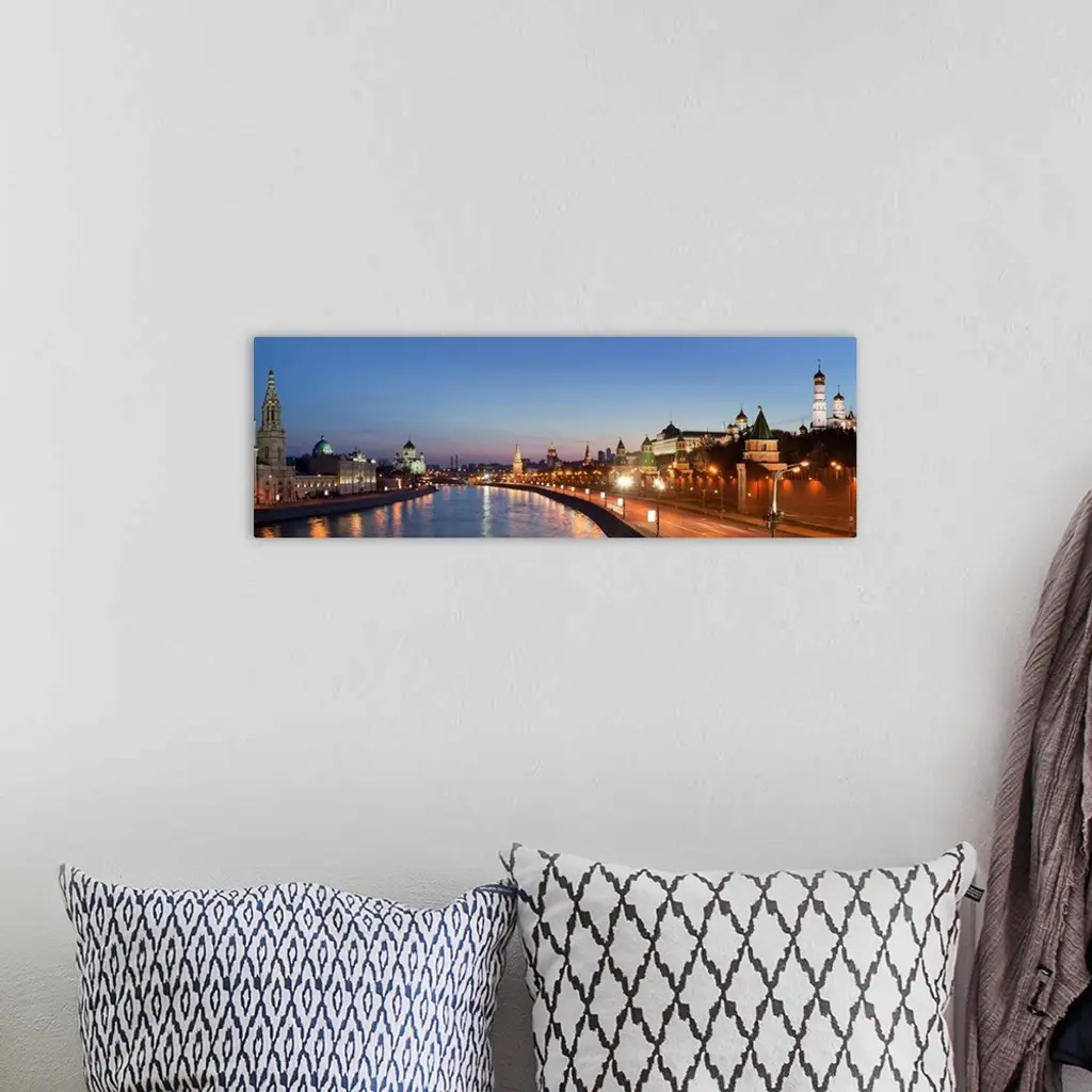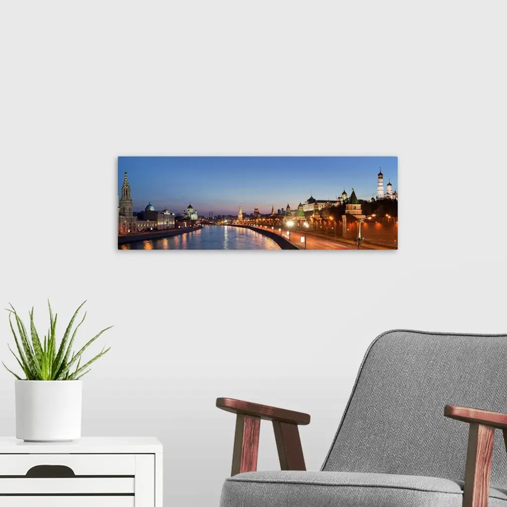 Russia, Moscow, Moscow River, Cityscape with Cathedral of Christ the Saviour and Kremlin at dusk
