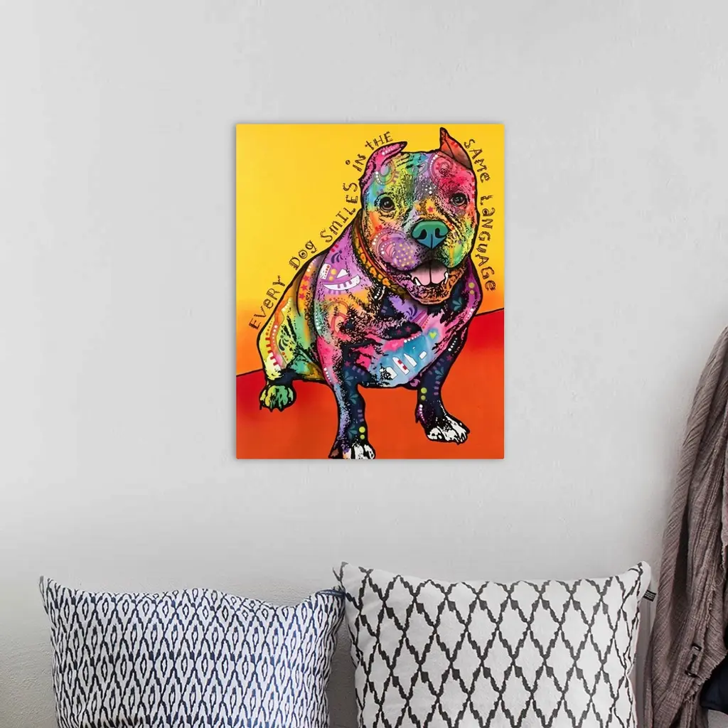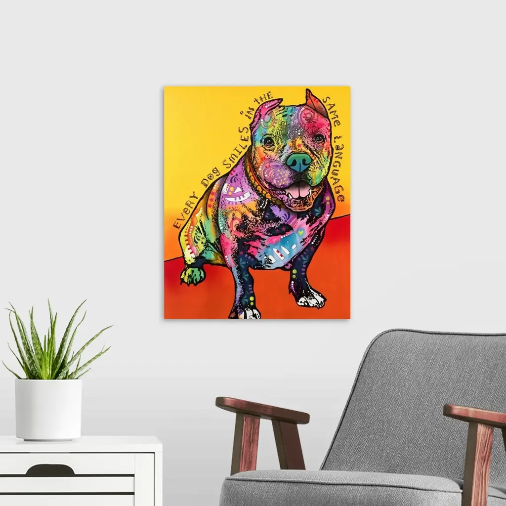 "Every Dog Smiles in the Same Language" handwritten around a colorfully painted pit bull on a yellow and orange background.