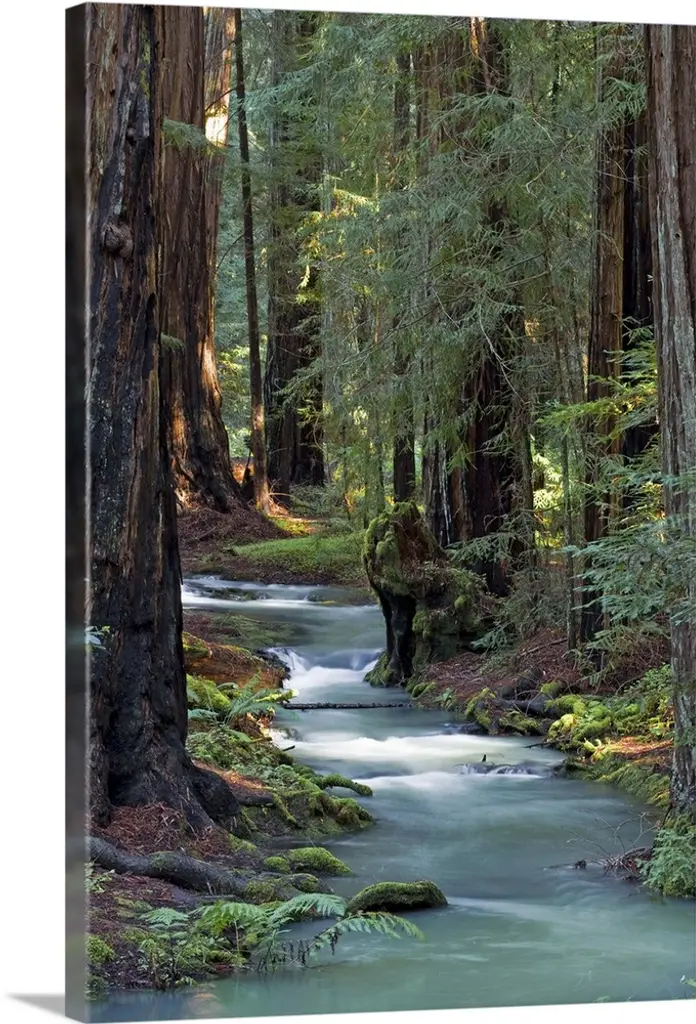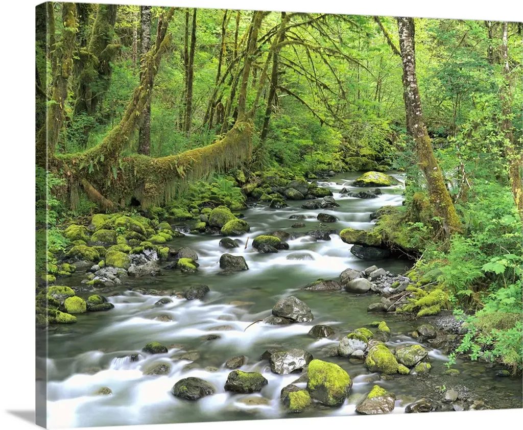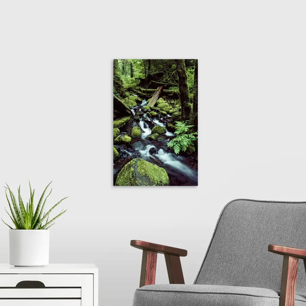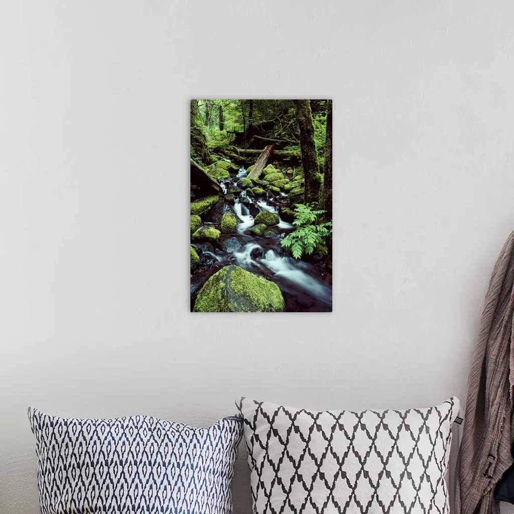 Tall image on canvas of water rushing down and through a forest covered in moss.