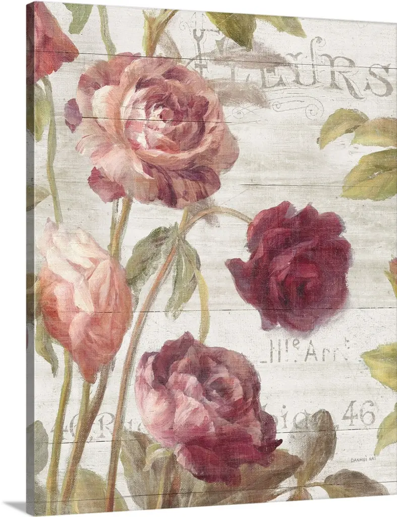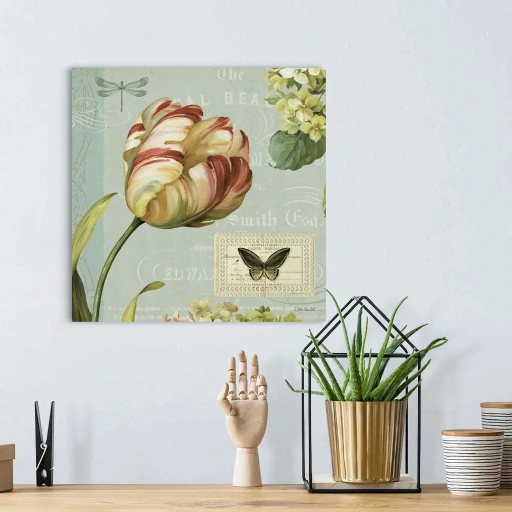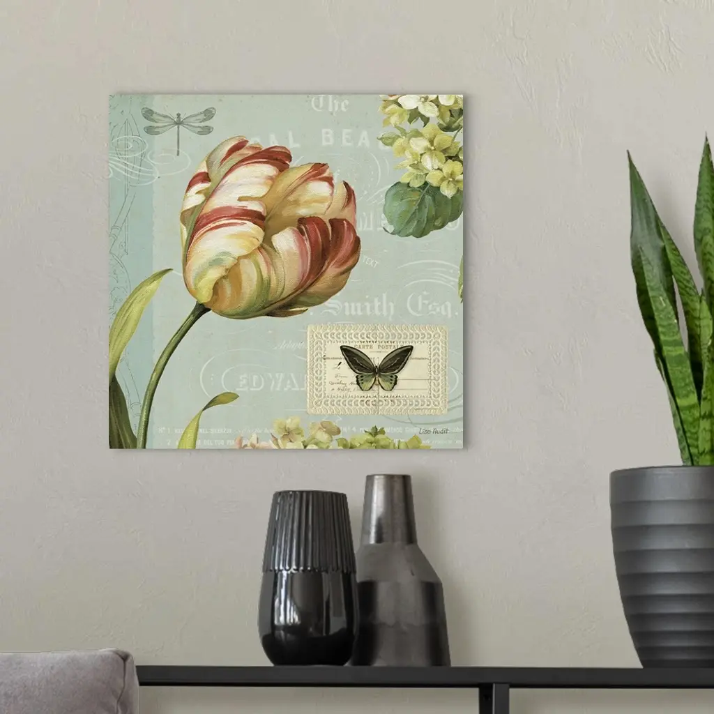 A decorative collage panel containing a tulip, hydrangeas, and a butterfly, with antique text and flourishes.