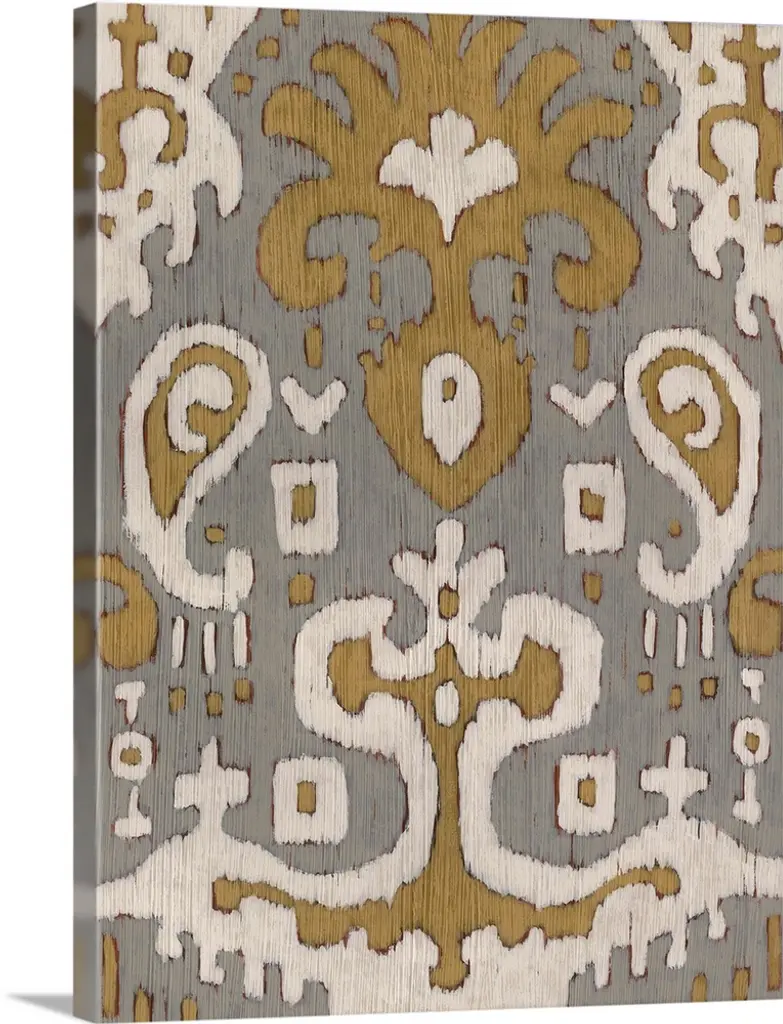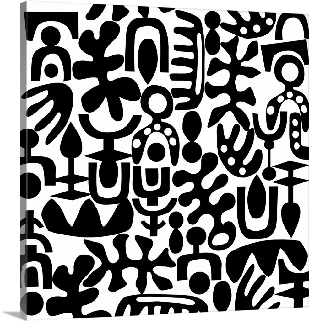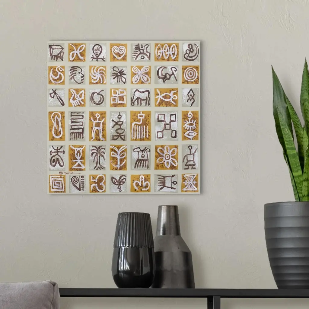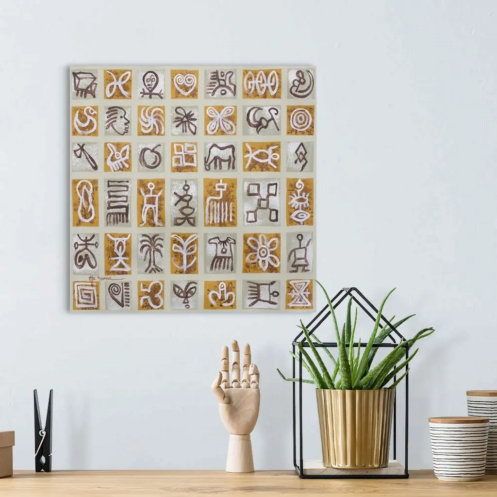 Symbols enjoy great importance throughout West Africa. Inspired by traditional adinkra symbols, Godwin Geoman creates his own in a handsome work of art. The hoe, the trees, the animals, all signify agricultural farming in Ghana. The faces depict the beauty of Ghanaian ladies, he says. The artist arranges his canvas in the style of West African textiles.