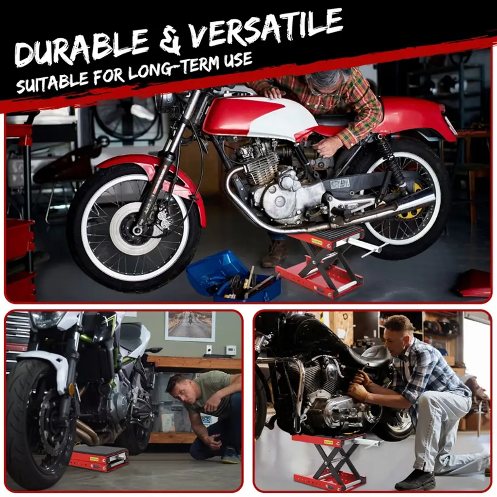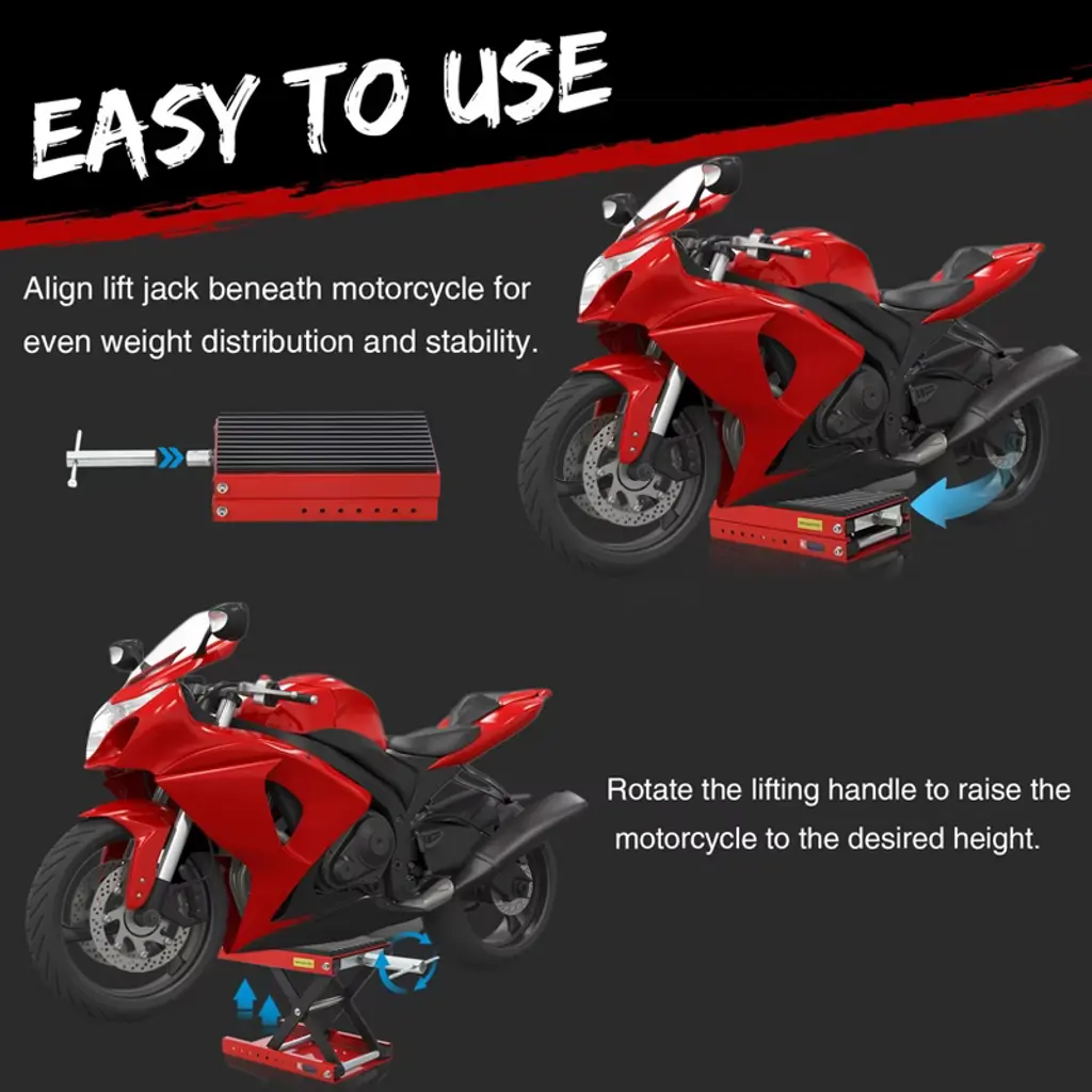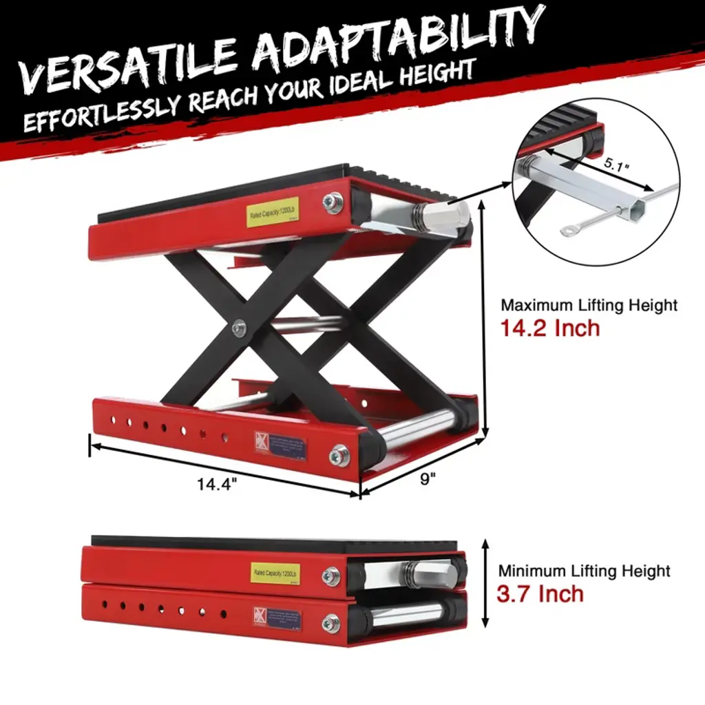Introducing the ultimate solution for motorcycle maintenance and care - the Motorcycle Lift Jack - 1200LBS Heavy Duty Scissor Stand. Designed for versatility and reliability, this lift jack is perfect for dirt bikes, ATVs, street bikes, and cruiser motorcycles. - **Versatile Application**: With a robust weight capacity of 1200 pounds, this Motorcycle Lift Jack is your go-to tool for lifting and maintaining a variety of motorcycle types. Whether you're working on dirt bikes, street bikes, cruiser bikes, adventure tourers, or ATVs, this stand is indispensable for maintenance and cleaning tasks in your garage.- **Secure and Safe**: Featuring a durable steel X-frame design with 6 safety locking positions, this 1200 LBS Motorcycle Stand Scissor Jack ensures a secure and stable anchoring system. It minimizes the risk of tipping, providing peace of mind and safety for both you and your motorcycle during maintenance.- **Enhanced Protection**: The top rubber pad is upgraded to a thickness of 11.5mm and includes a tread pattern to prevent slippage. This ensures better protection against slipping and scratching, while the wide 14.4"x9" platform offers a larger contact area, maximizing protection for your motorcycle and extending the stand's service life.- **Easy to Use**: Equipped with a ratchet wrench and a crank handle, lifting and lowering your motorcycle is a breeze. The adjustable height range from 3.7 inches to 14.2 inches makes it suitable for use in repair shops, garages, race tracks, and more.- **Enhanced Mobility**: Featuring a dolly with four sturdy iron casters, this motorcycle lift table allows for easy transportation of your motorcycle. Move your bike around your garage or workspace with convenience and ease.Upgrade your motorcycle maintenance routine with the Motorcycle Lift Jack - 1200LBS Heavy Duty Scissor Stand. Experience the perfect blend of versatility, safety, and protection, ensuring your motorcycle stays in top condition.