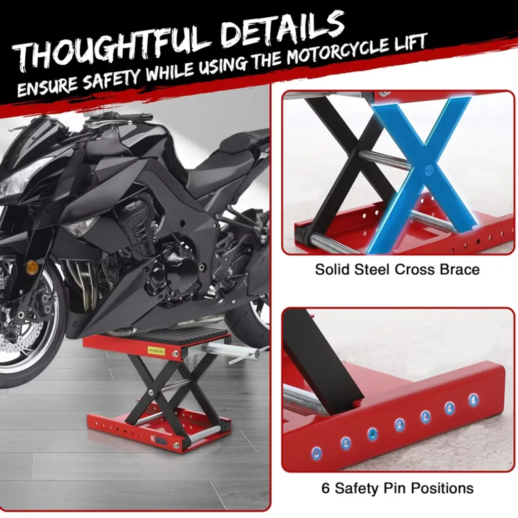 Motorcycle Lift Jack - 1200lbs Heavy Duty Scissor Stand With Wide Deck, Safety Pin, Versatile Application, Secure & Safe, Enhanced Protection