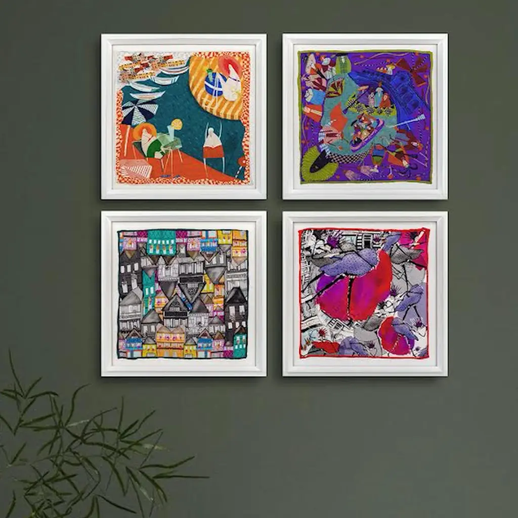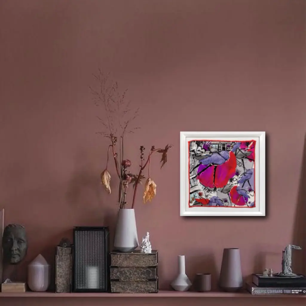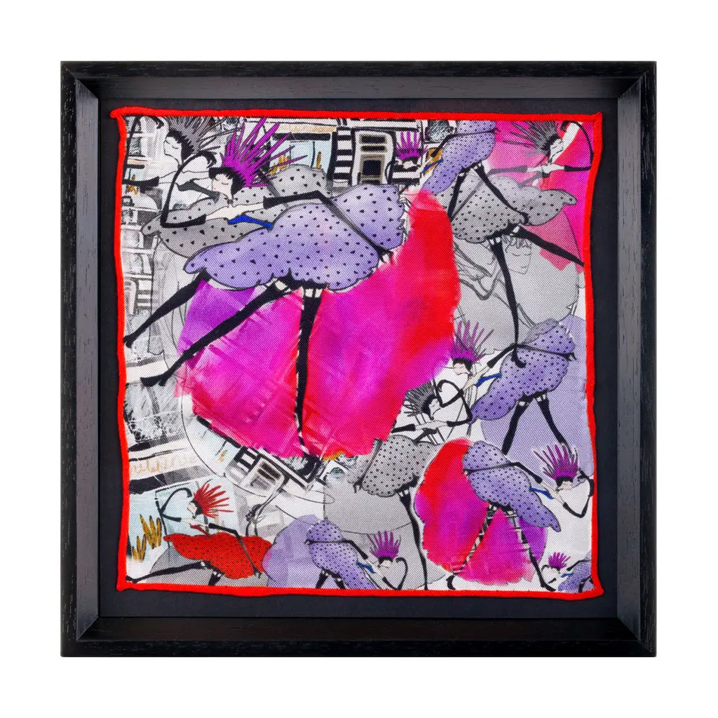 Inspired by the legendary Moulin Rouge, this design reflects the vibrant spirit of Parisian cabaret. Since its opening in 1889, Moulin Rouge has been a symbol of music, dance, bold costumes, and artistic freedom.The artwork captures the theatrical elegance of the era—flowing skirts, feathers, corsets, and the lively stage atmosphere of late 19th-century Paris. Created with refined lines and rich details, it brings the color, rhythm, and timeless allure of cabaret into modern living spaces.The paintings consist of special designs drawn by painters with a passion for art and travel.Color your Home with Art with Un Poco!· Our patterns are hand drawn and digitally printed.· 100% silk scarf with 100% wooden frame.· Size: 24 x 24 cm· The edges of our scarves are sewn by hand.