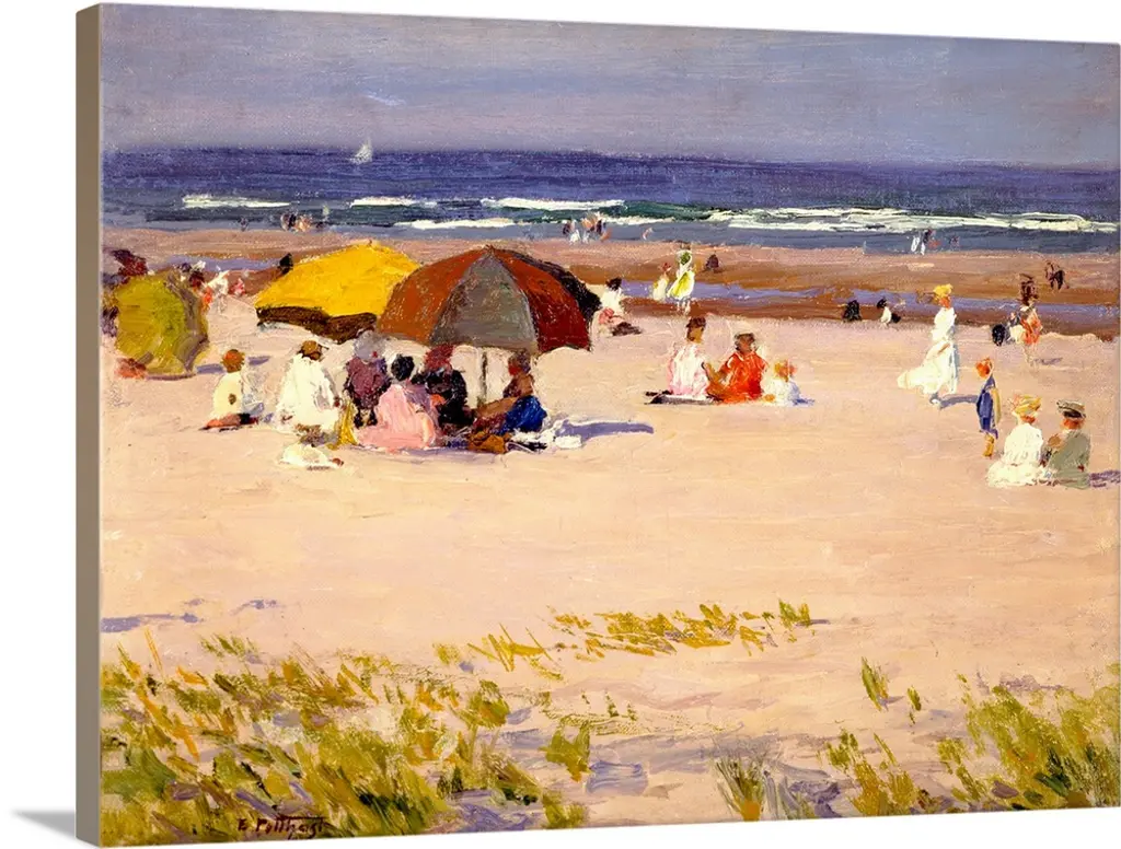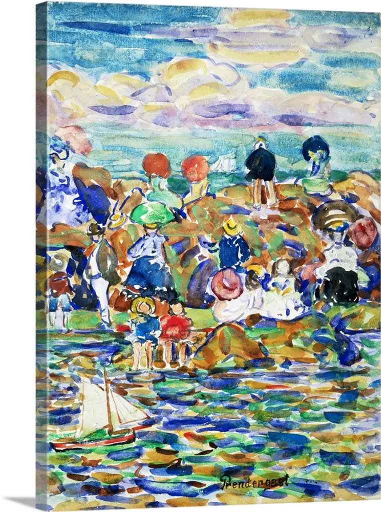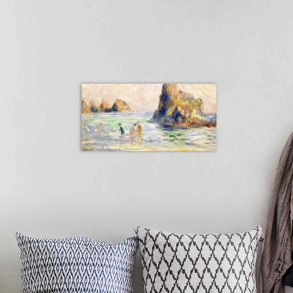 Large classic art composed of a set of couples as they enjoy the gentle waves crashing into them near the edge of a beach. In the background is a large arrangements of rocks as they sit within the ocean.