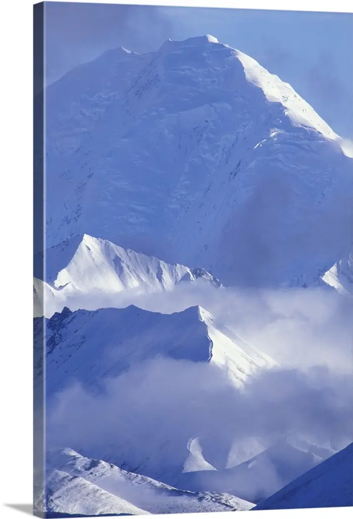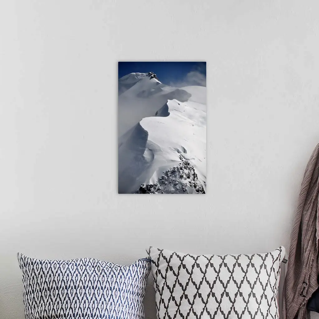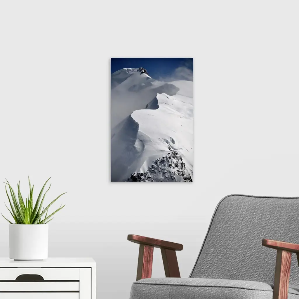 Mont Blanc du Tacul mountain of the French Alps in France with snow, sun and wind, vertical view.