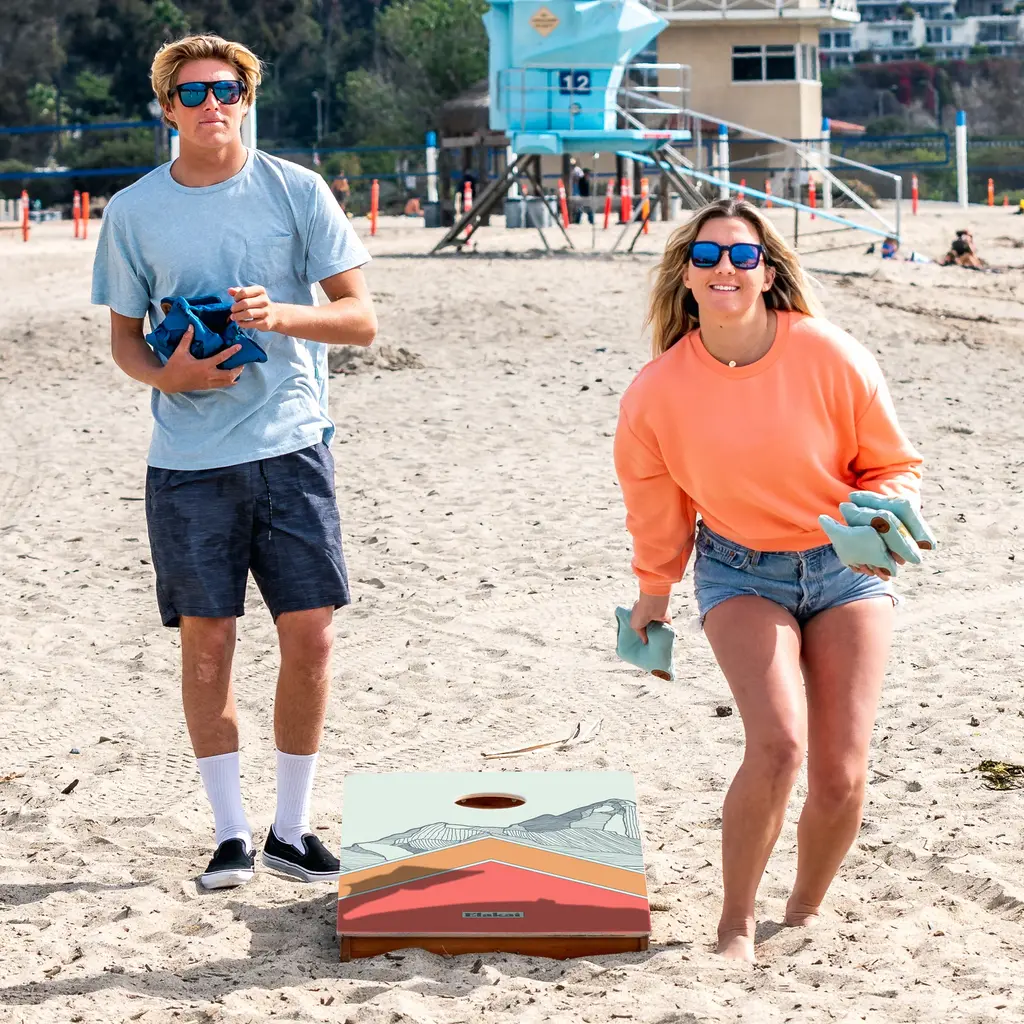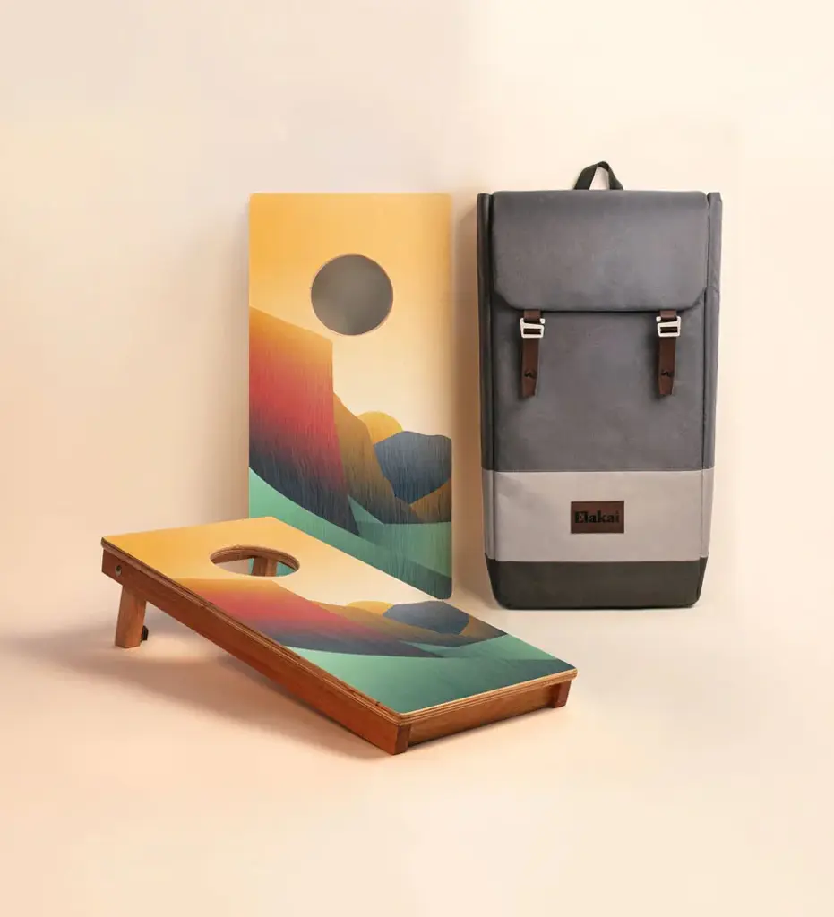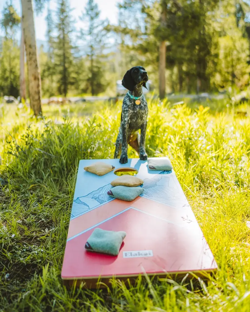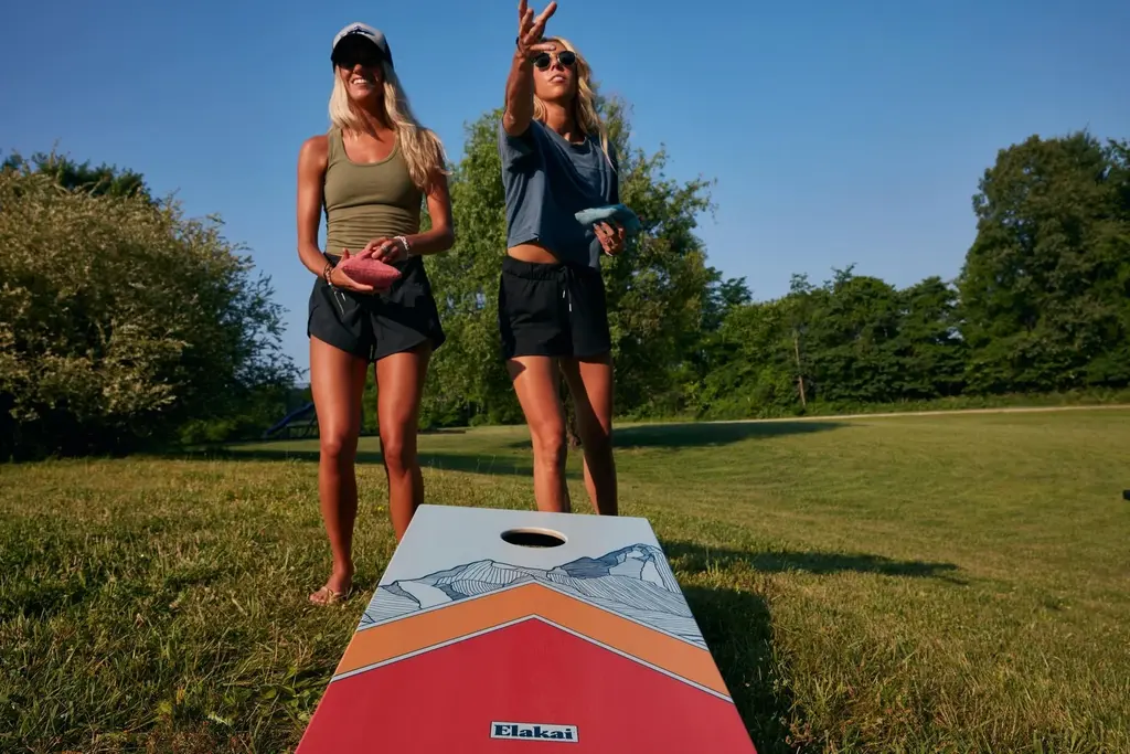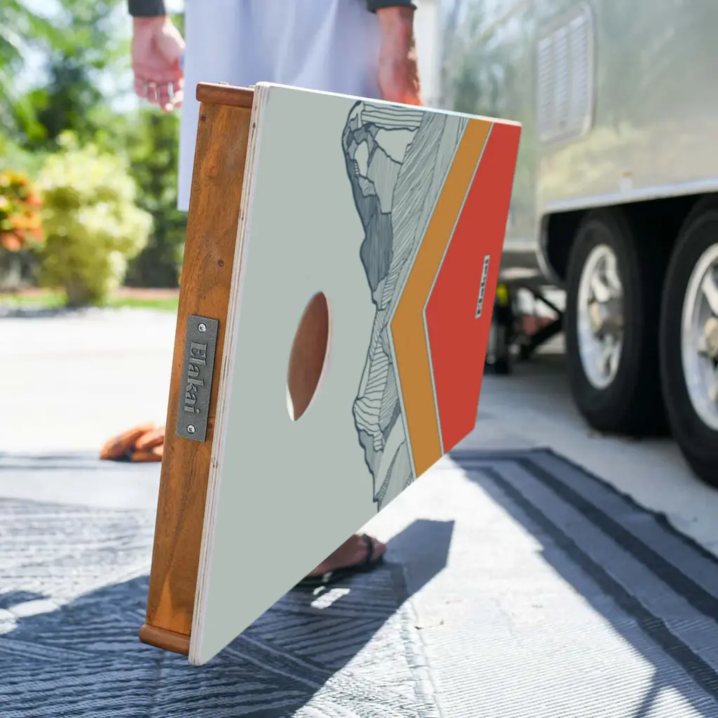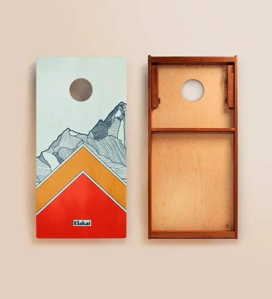 Carefully crafted from the finest materials, this two-by-four-foot regulation cornhole board set features a premium grade plywood deck with a beautiful mahogany frame. Outdoor-inspired graphics are printed directly to the wood surface.Proud partners of the National Forest Foundation and 1% for the Planet, Elakai is dedicated to protecting the environment as well as investing in social experiences. Their games are handmade from carefully-selected premium materials. Processed in small batches to the highest standards, each piece is unique and durable. Enjoy the outdoors with Elakai.Note: When not in use, this product needs to be stored indoors.