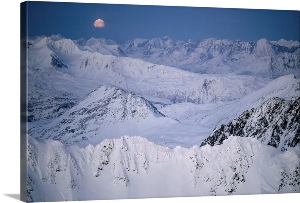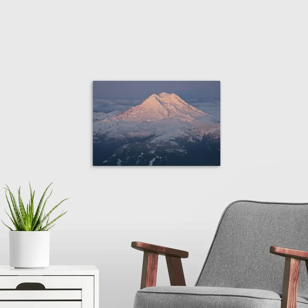 Landscape, aerial photograph of a snow covered Mount Rainier, surrounded by clouds, a dark sky in the background, in Washington.