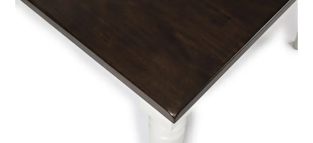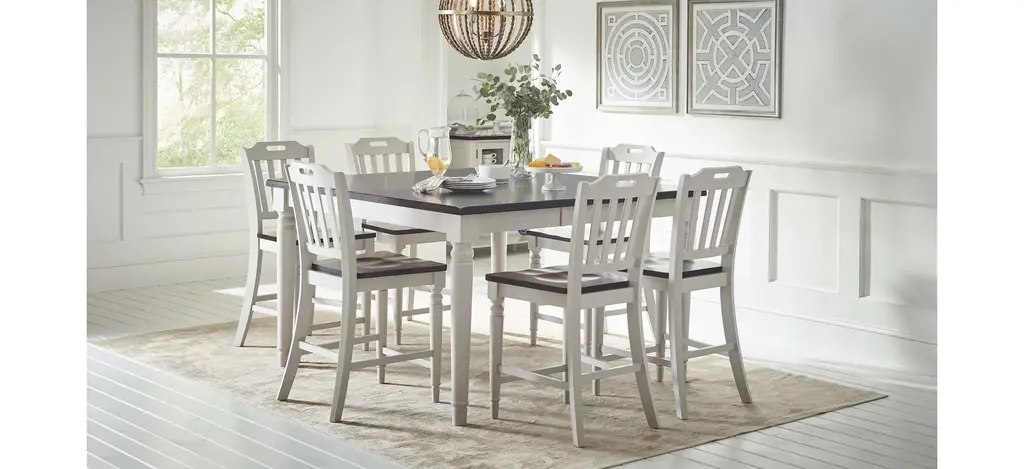 A striking pairing of a rich, dark top with a soft grey base, the Mount Vernon counter-height dining table provides an inviting stage for entertaining. With a leaf extension, the table is able to accommodate up to eight people. The table was made for dinner parties and family dinners. Solid wood construction offers the promise to withstand the wear and tear of those same dinners- and look good doing it.