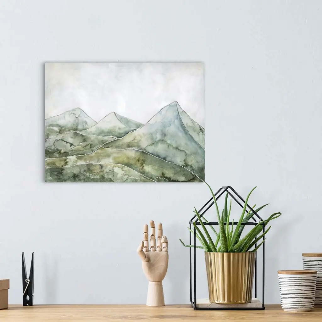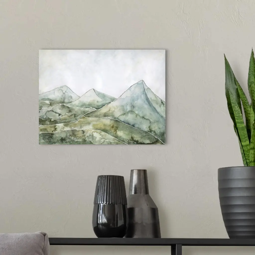 A contemporary stylized watercolor landscape featuring rolling hills in front of tall mountains in cool, calm tones