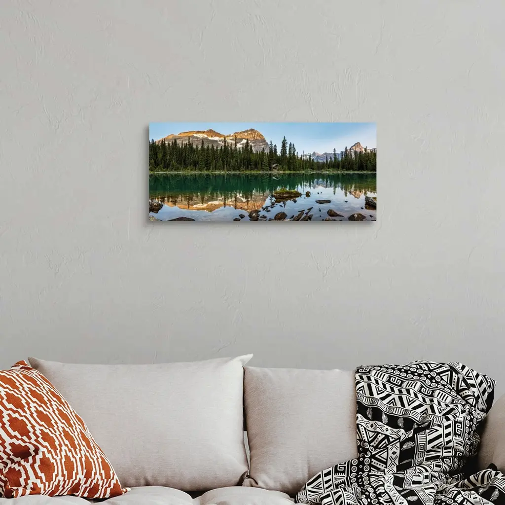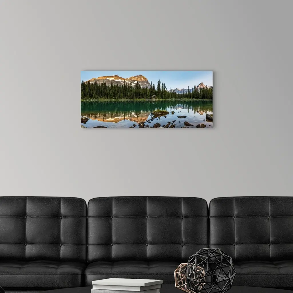 Panorama of mountain range reflecting in an alpine lake with the glow of warm early morning light and blue sky; British Columbia, Canada.