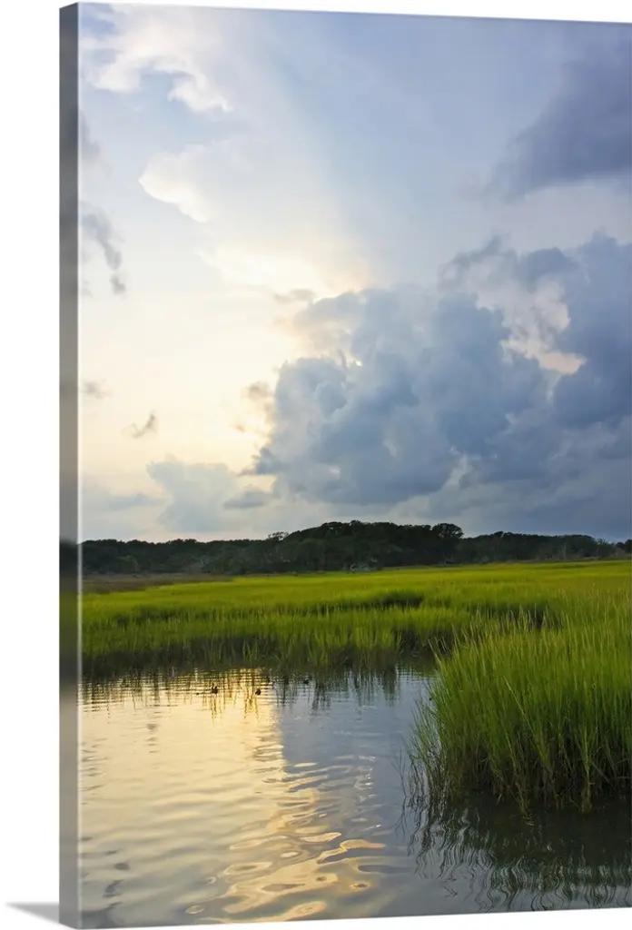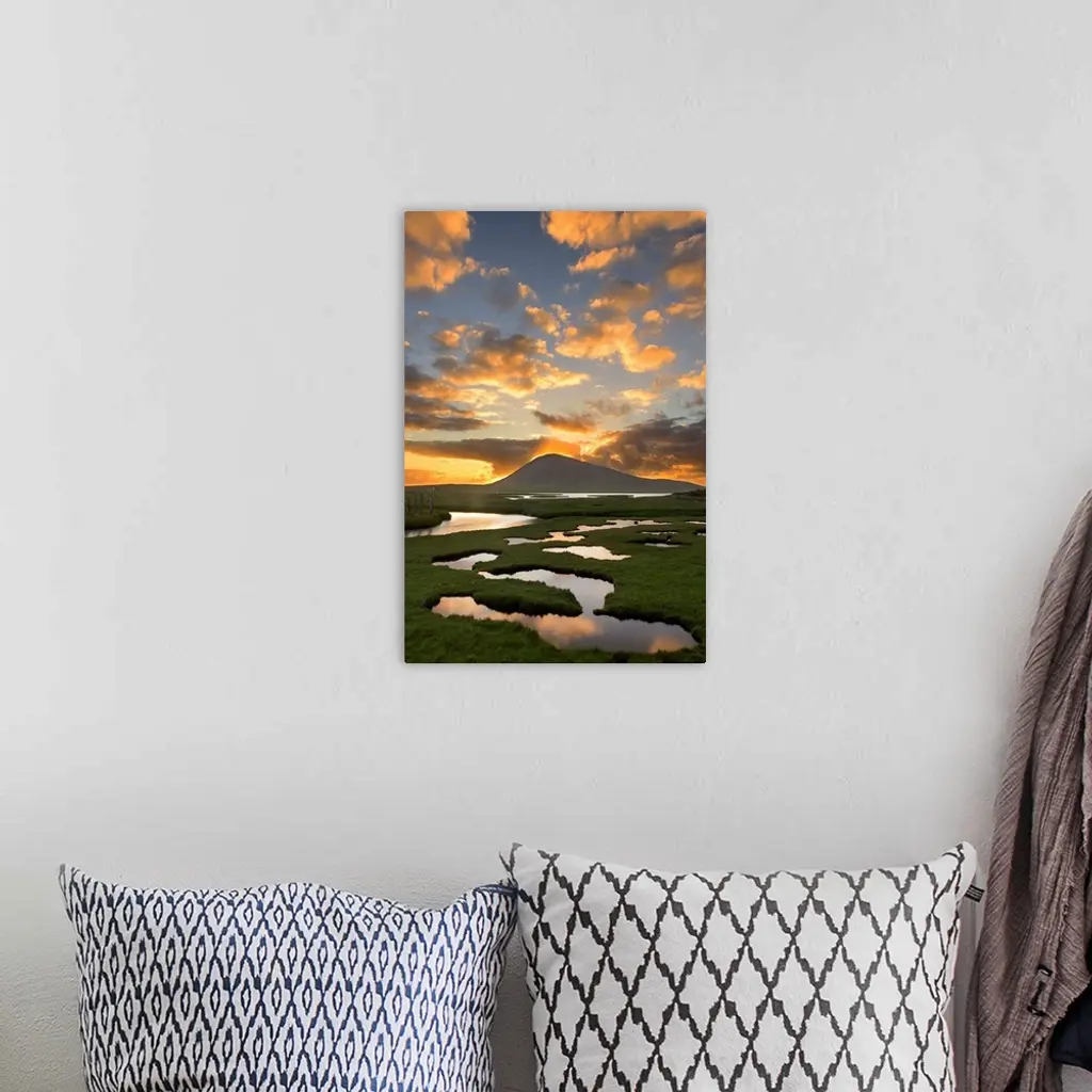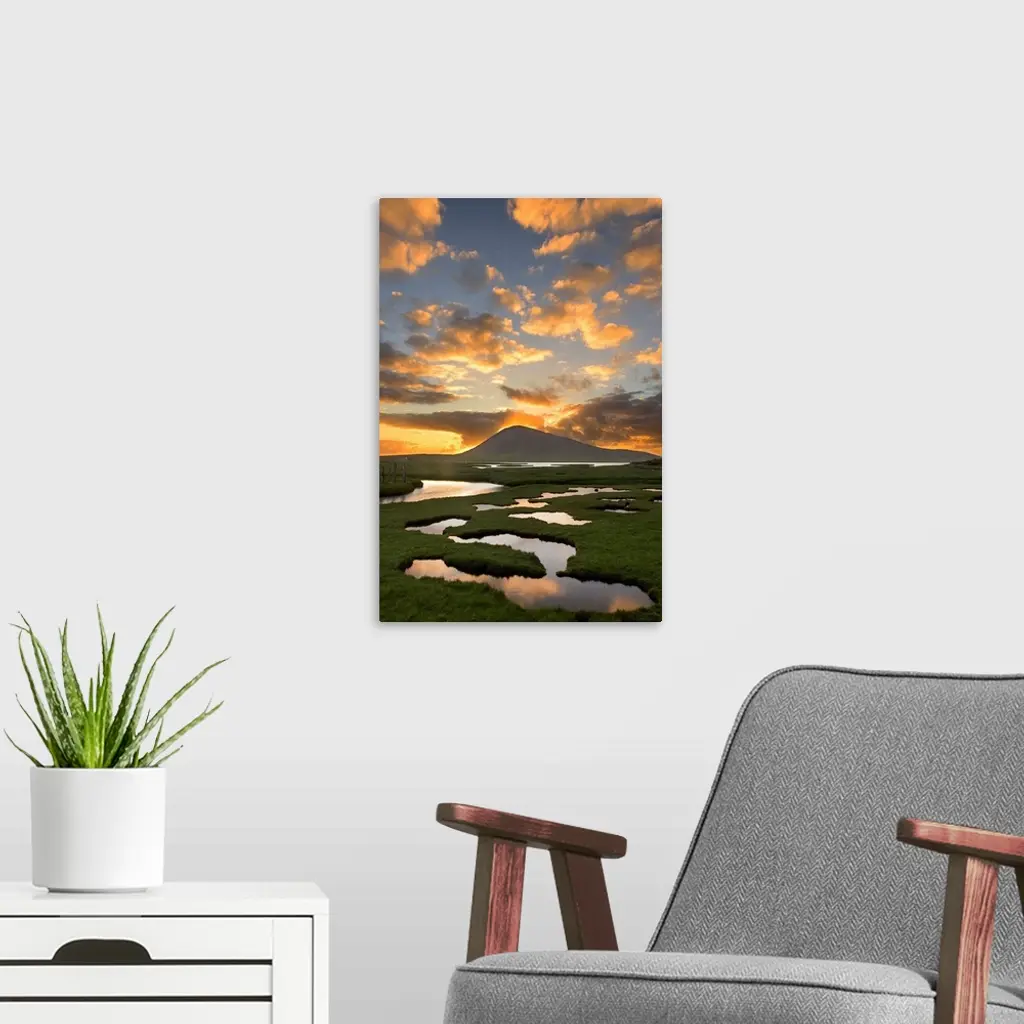 Landscape photograph of a sunrise beaming though a mountain with a marsh in the foreground.