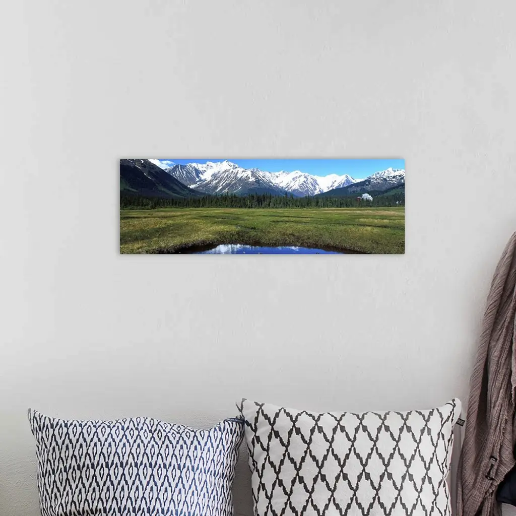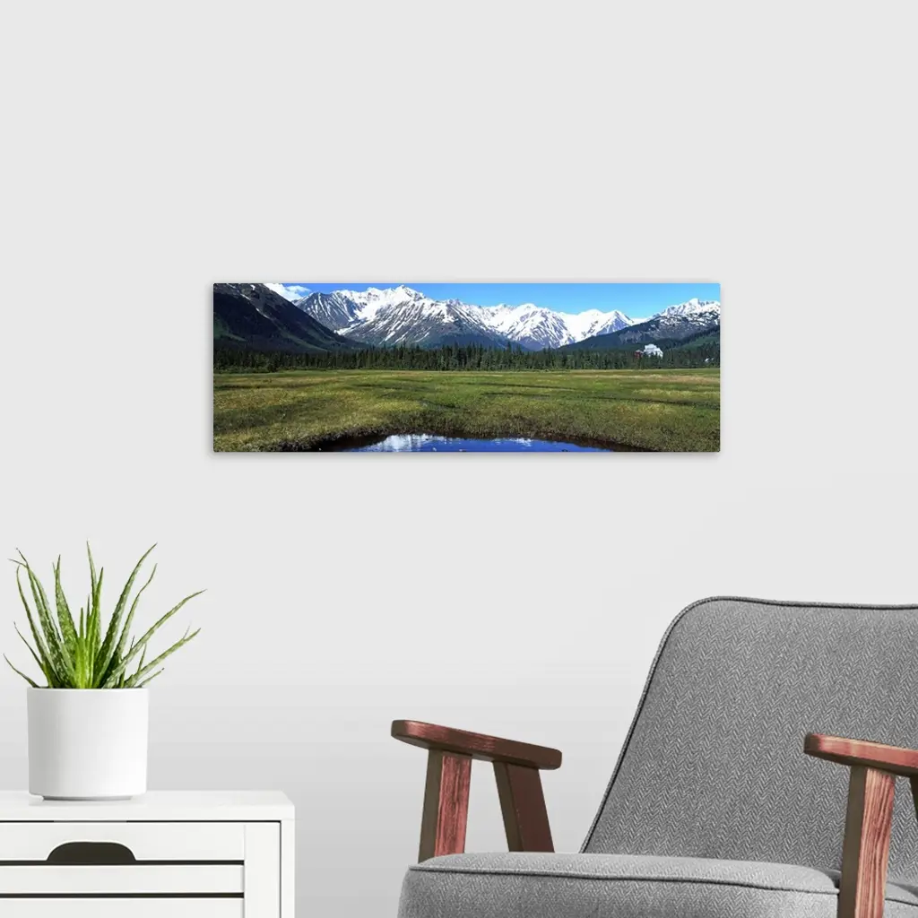Mountain scene with lake, distant hotel, Moose Meadow, Alaska wall art for home and office decor. Discover canvas art prints, photos, mural, big canvas art and framed wall art in GreatBigCanvas.com's varied collections.