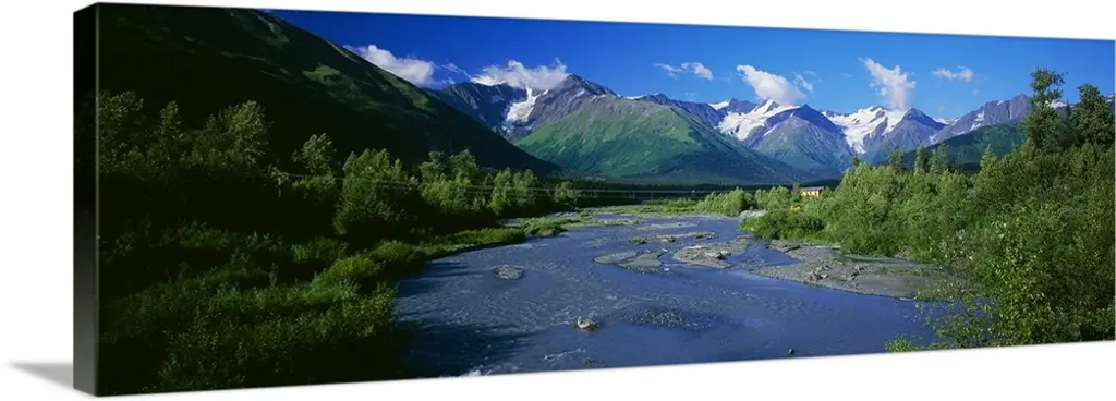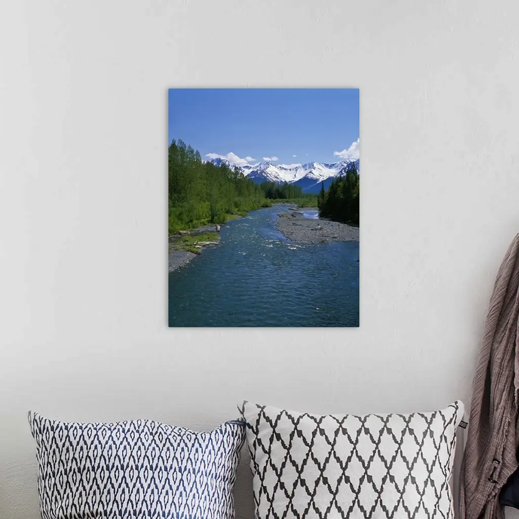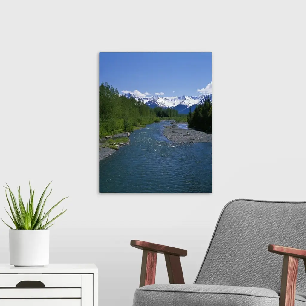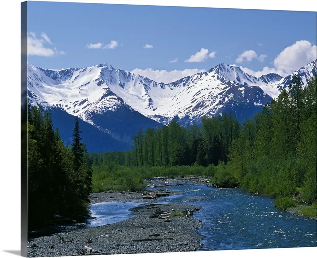 Mountain stream, snowy Chugach Mountains, summer, Alaska wall art for home and office decor. Discover canvas art prints, photos, mural, big canvas art and framed wall art in GreatBigCanvas.com's varied collections.