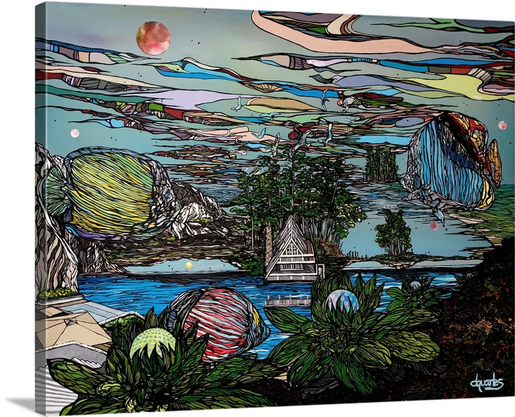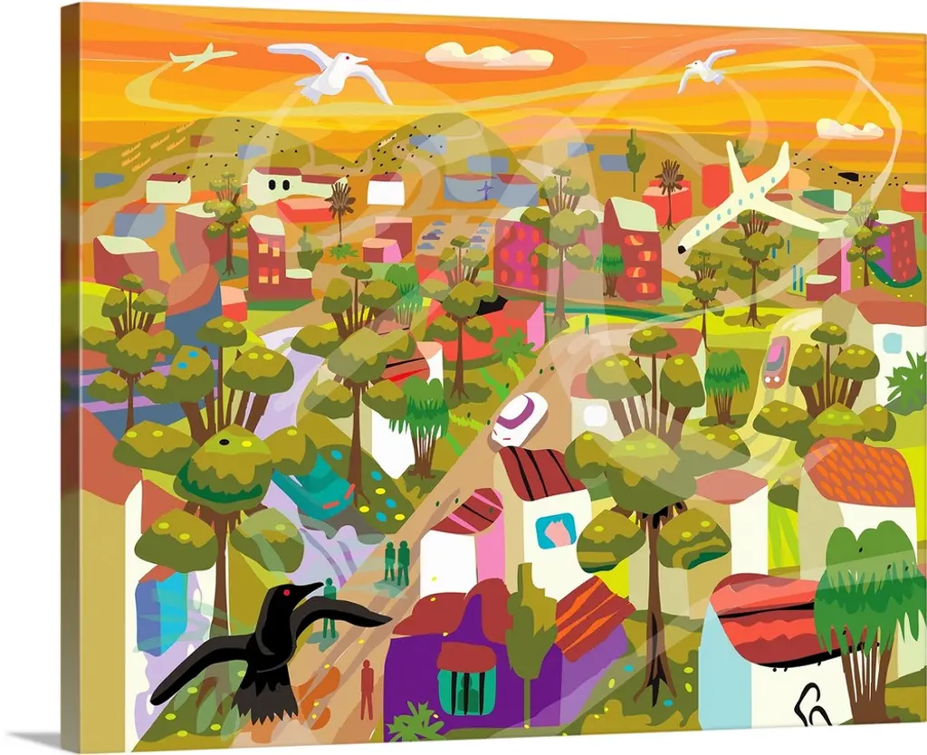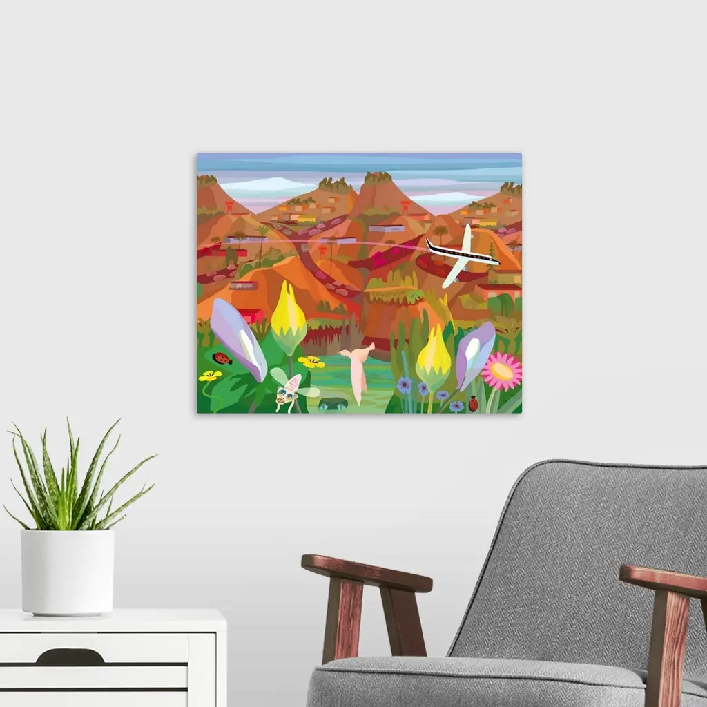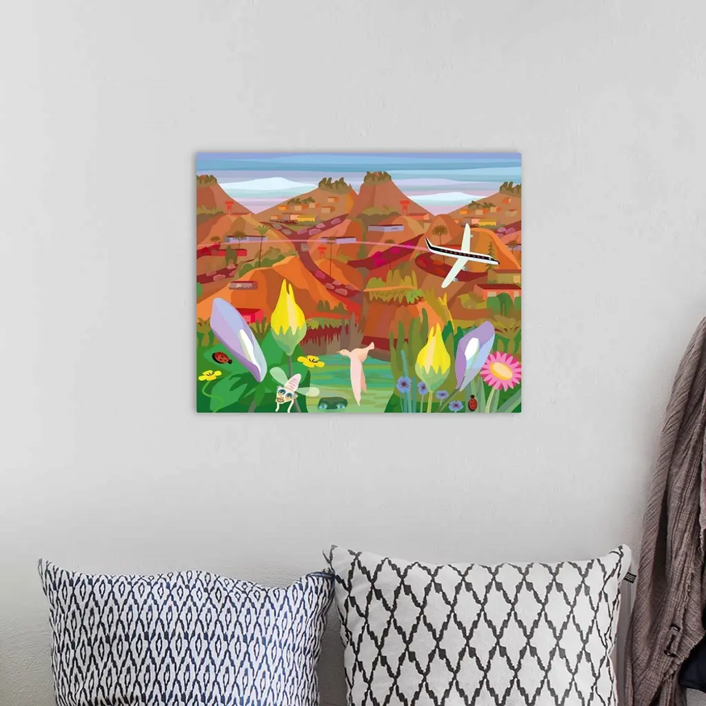 Lush, warm suburban landscape with houses, gardens, hills, sky and insects in foreground flowers.