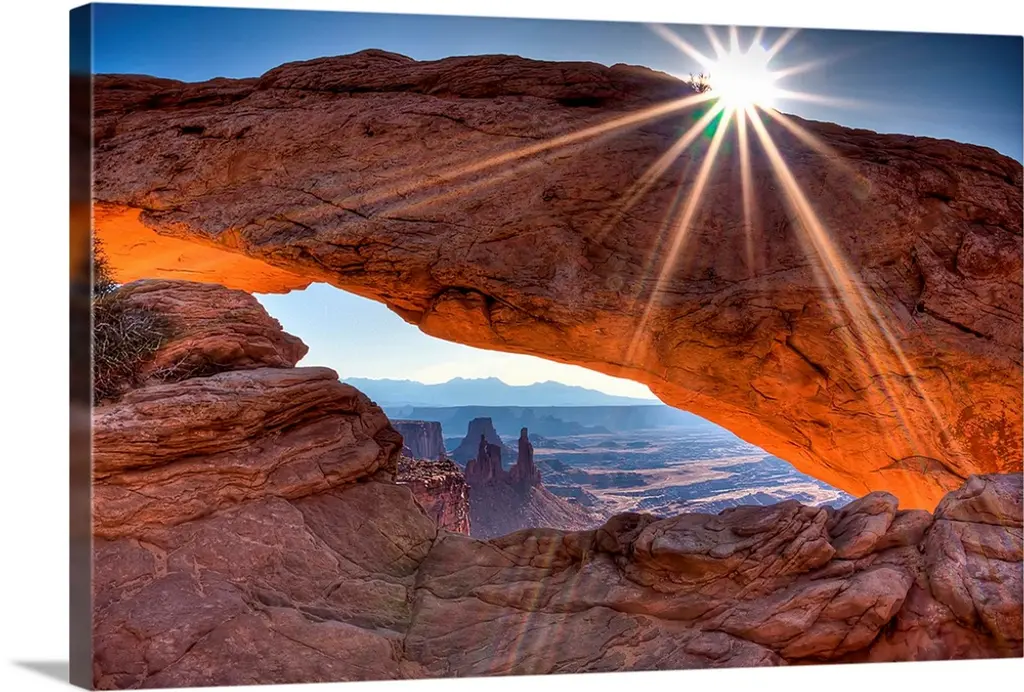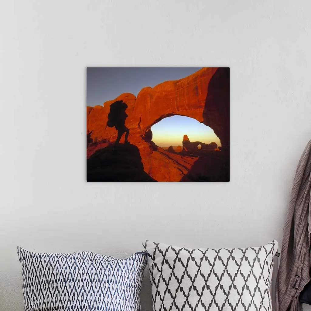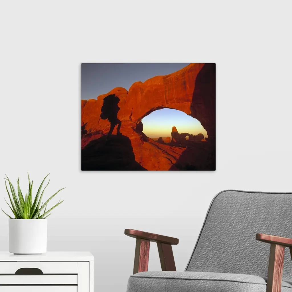 A hiker is photographed looking out onto massive cliffs and arches in a Utah national park.