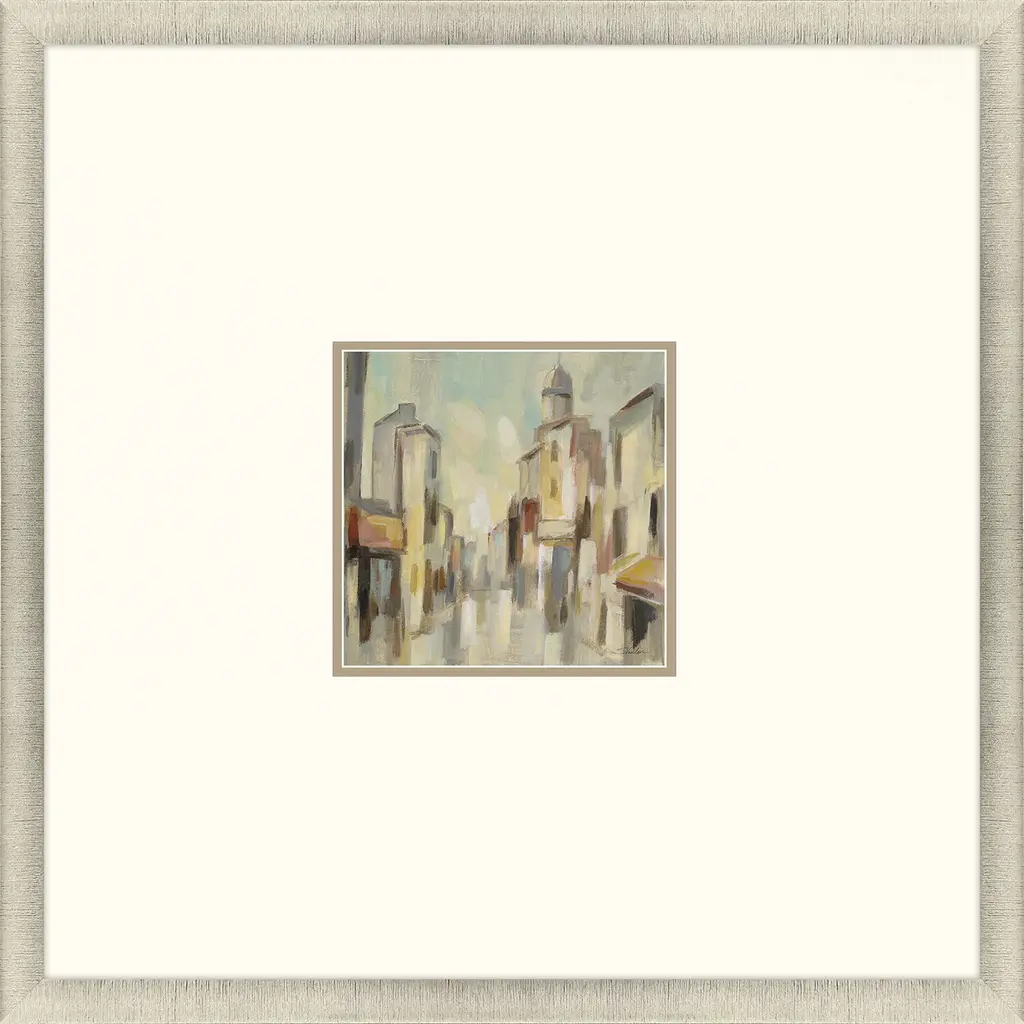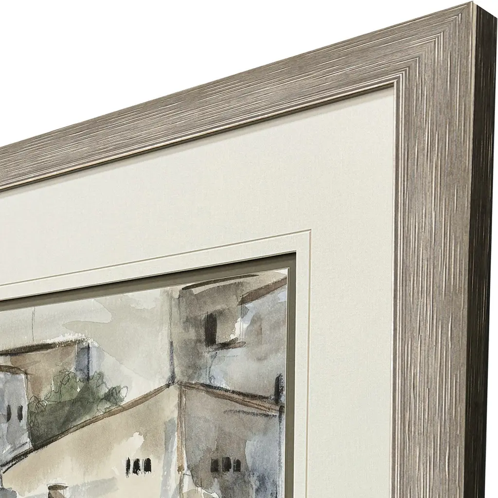A charming mountain village is accented in raised premium matting with a linen look. Famed in a distressed silver finish molding with embossing.